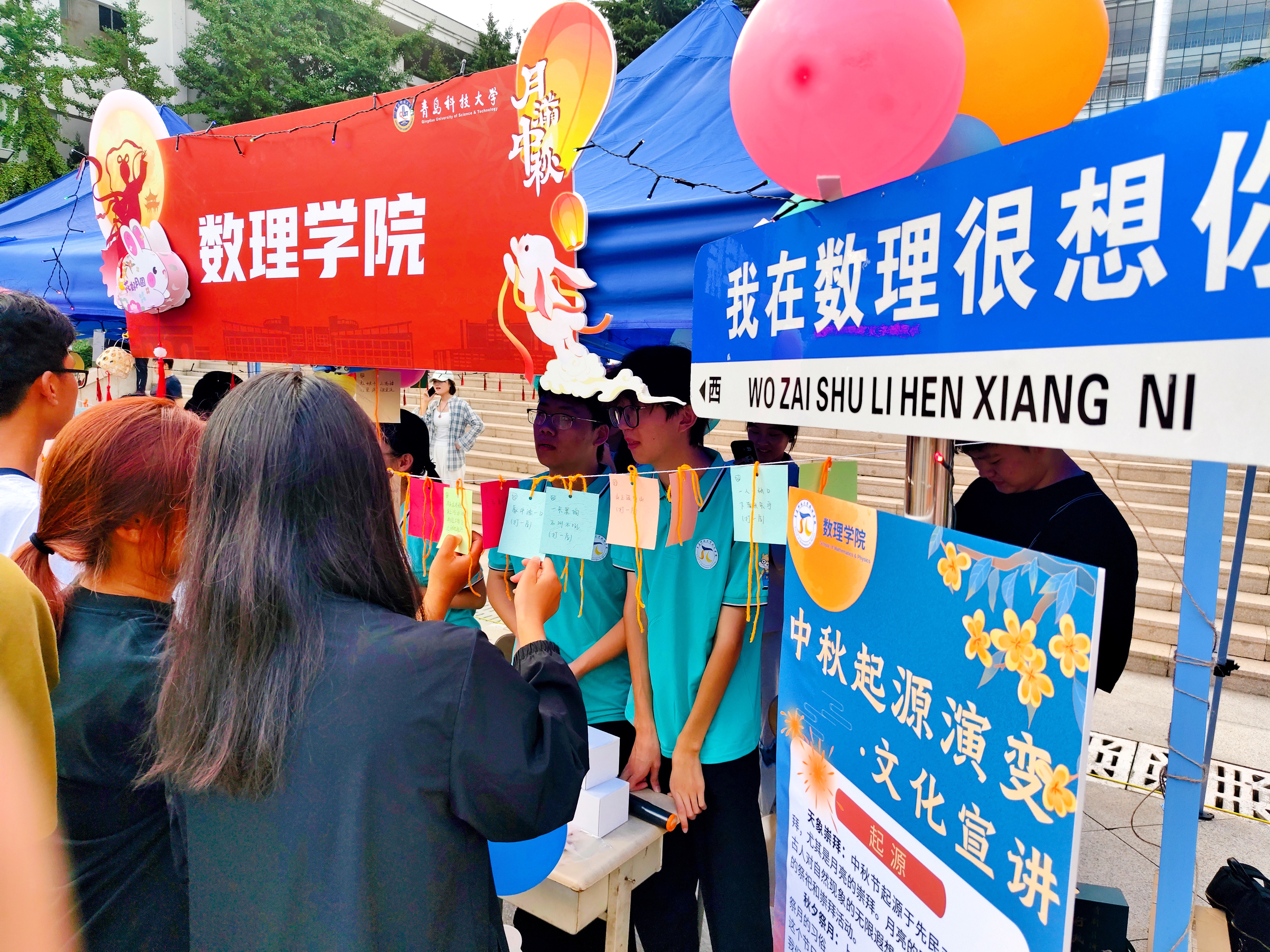 校团委、校学生会、校研究生会举办“团团邀你一起过中秋”中秋游园会,在崂山校区弘毅广场、四方校区小五四广场分别设置主题活动区,开展“灯谜映月,佳节共庆”中秋猜灯谜、“月满中秋共博趣,饼香四溢话团圆”中秋博饼、“诗意中秋话家国,我邀明月颂中华”诗词飞花令、“时刻定格,情溢科大”中秋节拍照打卡等活动,用青年学生喜闻乐见的形式弘扬优秀传统文化,营造活泼欢乐、温情有趣的校园氛围。同时,组织各院级团组织、学生会组织以及学生社团结合自身特色开展主题中秋活动,大学生艺术团带来的动感音乐、青春舞蹈,各活动区开展的做彩灯、掷飞镖、赠月饼等小游戏,让青春校园里充满欢声笑语。