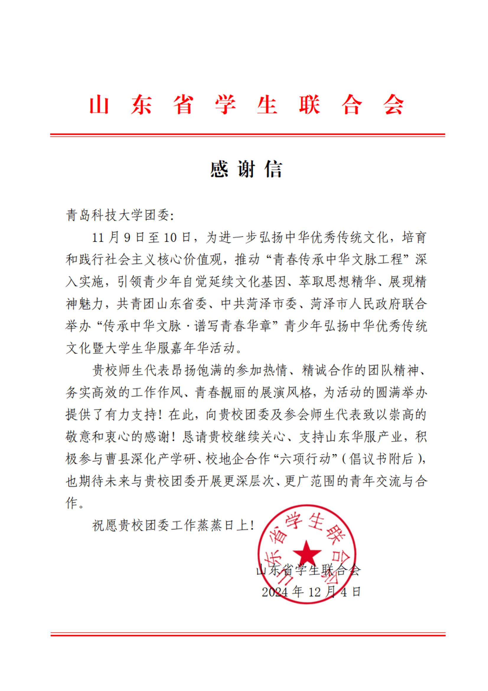 11月9日至10日,由共青团山东省委、中共菏泽市委、菏泽市人民政府联合举办的“传承中华文脉·谱写青春华章”青少年弘扬中华优秀传统文化暨大学生华服嘉年华活动在山东曹县举办,我校学生社团汉韵研习社4名成员受邀参加本次活动。近日,山东省学生联合会向我校团委发来感谢信,对我校师生积极参与此项活动表示感谢。