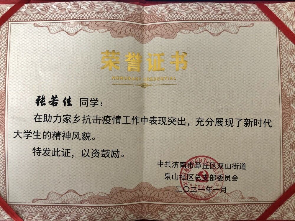 张若佳同学假期返乡后主动融入济南市联防联控、群防群治的治理大网络,做到相互协作、共克时艰。与社区党委一同挨家挨户排查登记外来返乡人员信息,并录入信息排查表,对于未登记的人员电话通知并耐心建议其至社区登记,希望凭借自己的微薄之力为此次疫情贡献一份力量。该同学认真负责的工作态度得到了社区工作人员的一致好评。