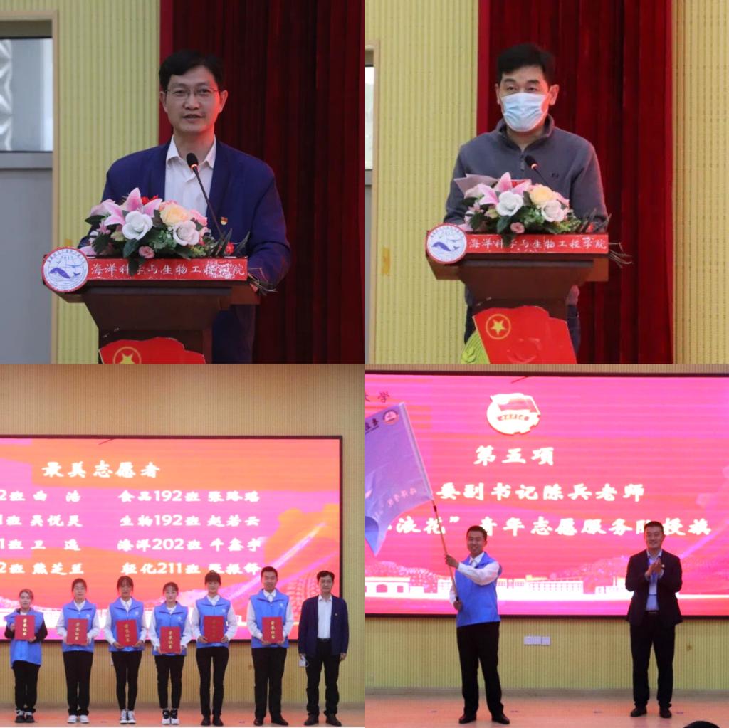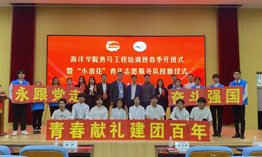 为深入学习贯彻习近平总书记在庆祝中国共产主义青年团成立100周年大会上的重要讲话精神,培养思想坚定、素质过硬、能力突出、格局远大的青年马克思主义者,5月12日下午,海洋学院“青马工程”培训班春季开班仪式暨“小浪花”青年志愿者服务队授旗仪式在四方校区讲学厅举行。校团委副书记陈兵、学院党总支书记周宪锋、党总支副书记兼副院长臧传永、全体专兼职辅导员以及部分学生干部、学生志愿者参加活动。