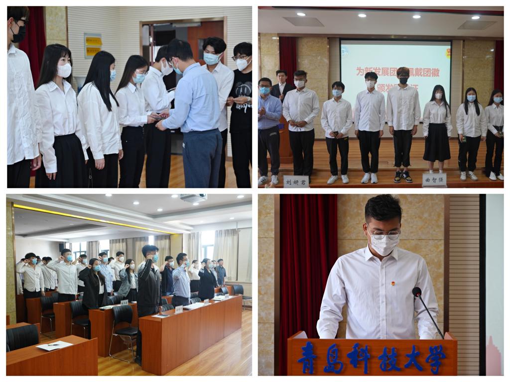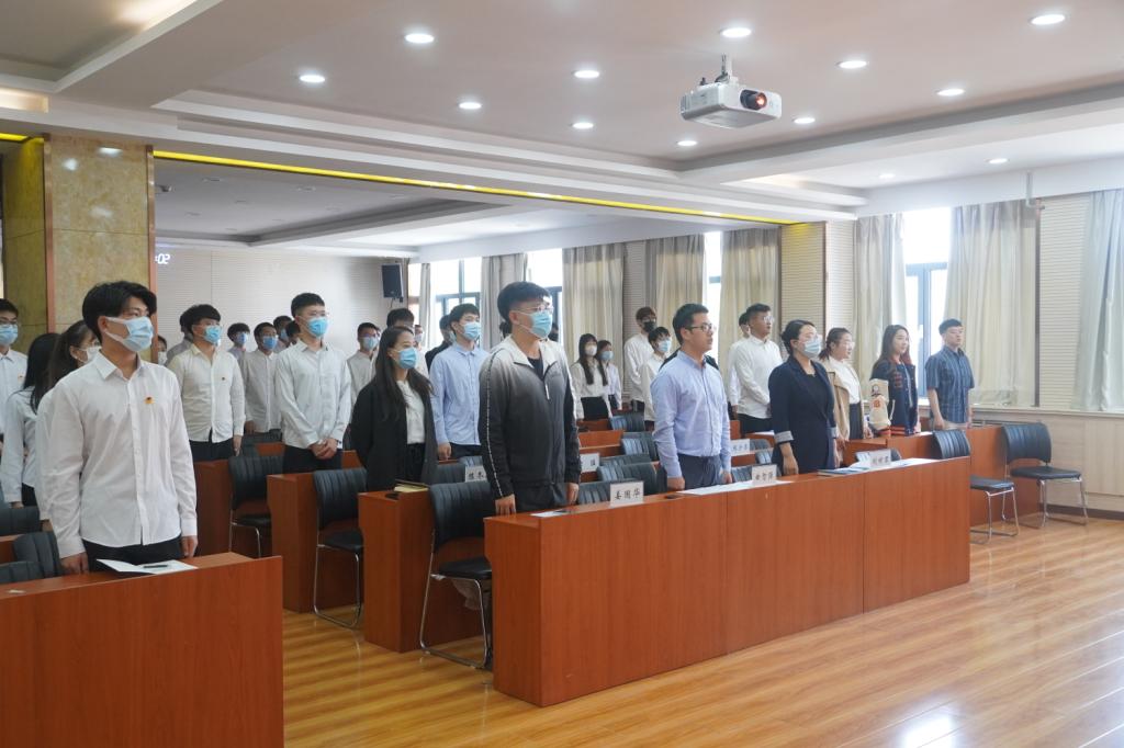 随后,学院团委书记曲智强为新发展团员佩戴团徽、颁发团员证。面对鲜艳的团旗,全体团员举起右手庄严宣誓,铿锵有力的宣誓声表达了不忘初心、奋勇前行的决心。