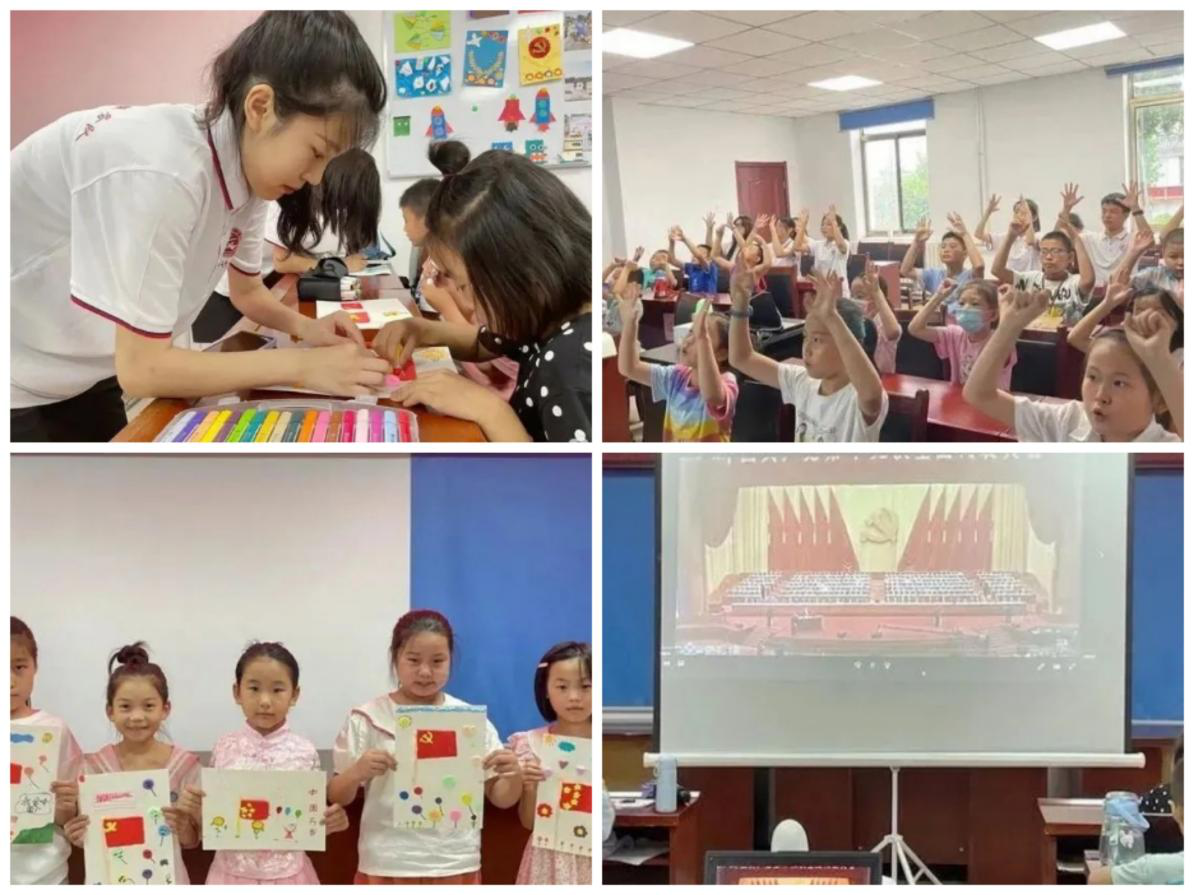 参观过后,团队成员经过了两天的准备,于8日前往平阴县孔村镇孔庄村暑假托管班,为小朋友们带来了家乡党史学习教育课。团队成员从“出发,走革命长征路!”、“敬礼,向革命先烈致敬”,“努力,学习前辈精神”三方面开展宣讲,并通过提问、手指操以及手工制作等多种形式让小朋友们融入课堂。