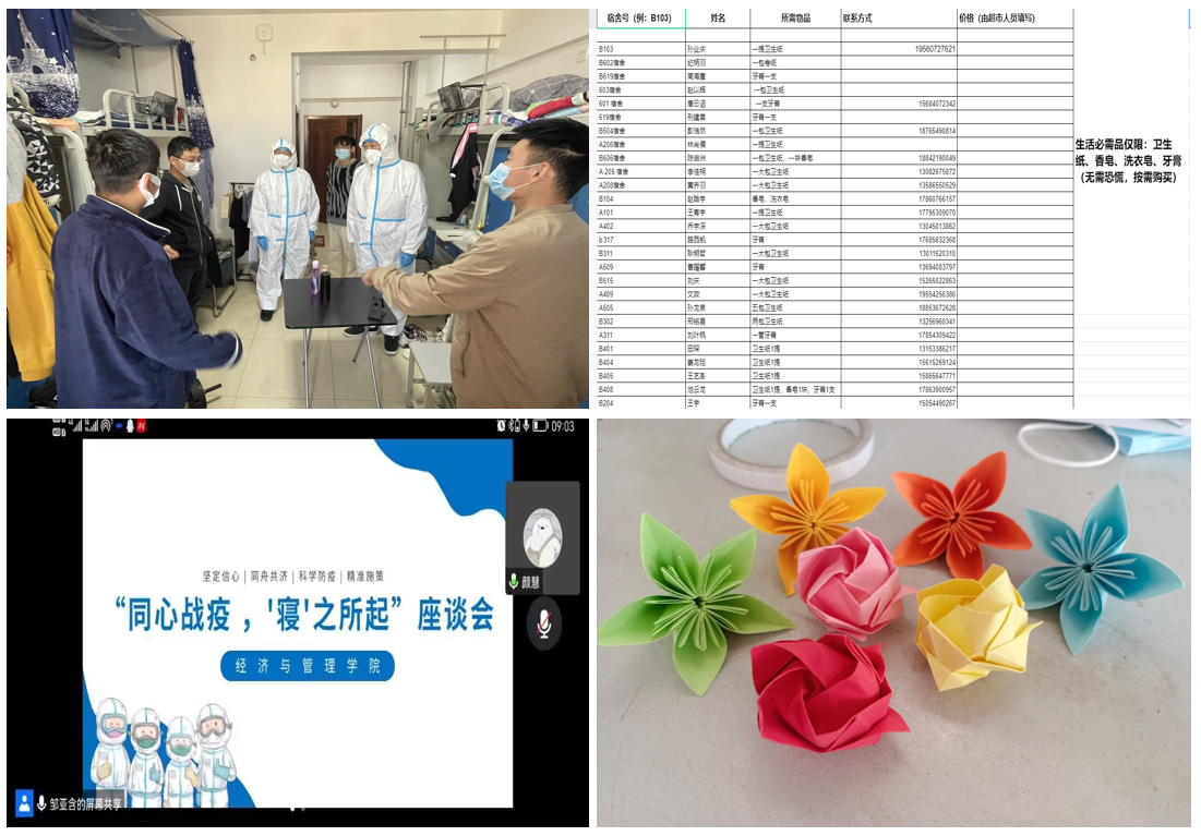 坚持“生”字为本,解决难题慰人心。校园静默管理以来,经管学院想学生所想,急学生所急,学院书记、院长及辅导员深入学生宿舍,了解学生的生活情况,完成学生一对一谈话及重点学生访谈工作,确保特殊时期安全稳定;各宿舍楼宇通过建立在线表格,及时调研、收集静默同学的各项需求,整理成任务清单,最快速度解决问题;静默管理解除后,学院在遵循疫情防控管理要求的基础上,第一时间召开楼层长抗疫总结分享集体心理团辅活动,以暖心的水果和茶点慰问辛勤付出的志愿者同学,鼓励大家继续发扬抗疫精神,以永不懈怠的精神状态和一往无前的奋斗姿态,团结一心,加压奋进。