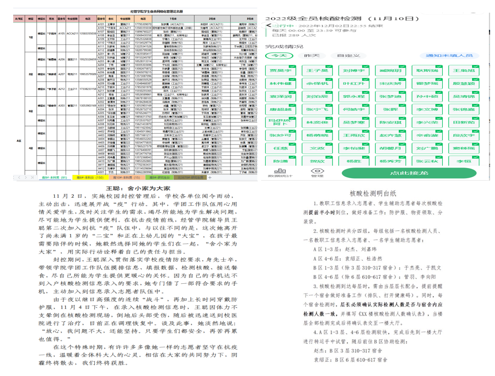 坚持“快”字当头,网格管理强秩序。校园疫情保卫战打响的第一刻起,经管学院迅即响应,根据学院常态化学生宿舍网格化管理体系,设置楼长、层长、舍长三级网格化管理联络机制,落实监督责任,持续做好学生的静默管理工作,确保不同宿舍学生人员避免出现交叉情况;规范核酸检测流程,制定《核酸检测明白纸》,创新使用“群报数”小程序,每日核酸检测后学生需上报“核酸检测标识”,各年级、各专业由专人负责每日核查,层层压实责任,确保核酸检测不漏一人。