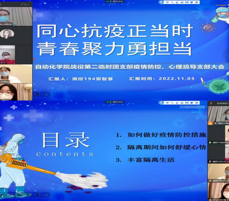 以“组织力”凝聚青年,集结“青”力量齐心“战疫”。青年在哪里,团组织就建在哪里。静默管理期间,学院团委迅速在北苑7号楼、南苑1号楼、南苑6号楼等楼宇成立了“战疫”临时团委,及时做好疫情期间各项工作,确保信息和渠道畅通,发挥团支部在当前防疫工作中的战斗堡垒作用,凝心聚力,坚决打赢疫情防控阻击战。自动化学院团干部“疫”不容辞,率先挺身而出,投身疫情防控工作,统筹生活物资的配送,就医需求协调,情绪疏导安抚的工作,切实保障学生们的健康和平安,各年级团干部在得知楼层招募志愿者时,“疫”呼即应,冲锋在前,各个宿舍楼涌现出了强大的青春动能,在招募令下发三分钟内,100余人参与报名,志愿加入到抗疫队伍中,奉献自己的一己之力,为疫情防控工作注入新力量,齐心抗疫,和衷共济克时艰。经过96小时的静默管理,校内有序放开,逐步恢复生活、学习秩序,为改善同学们疫情封闭期间的身心状态,学院在校园内开展了“抗击疫情健步走,踔厉奋发勇担当”主题团日活动。校长陈克正参与了主题团日,并与师生进行了亲切的交流。同学们深刻认识到要继续严格遵守防疫规定,以身作则,发挥好模范带头作用,同时也要加强体育锻炼,增强体质,以更加饱满的热情投身于学习、工作和生活中。