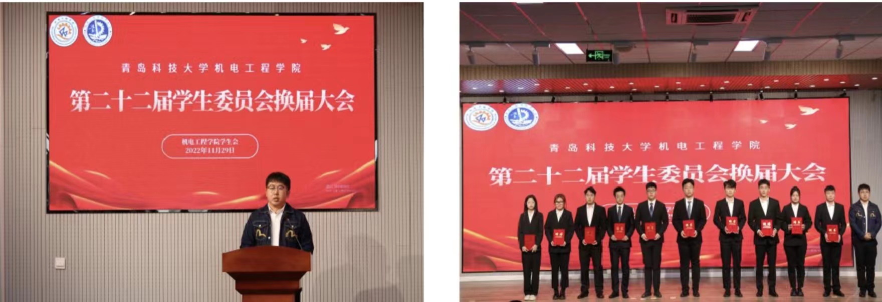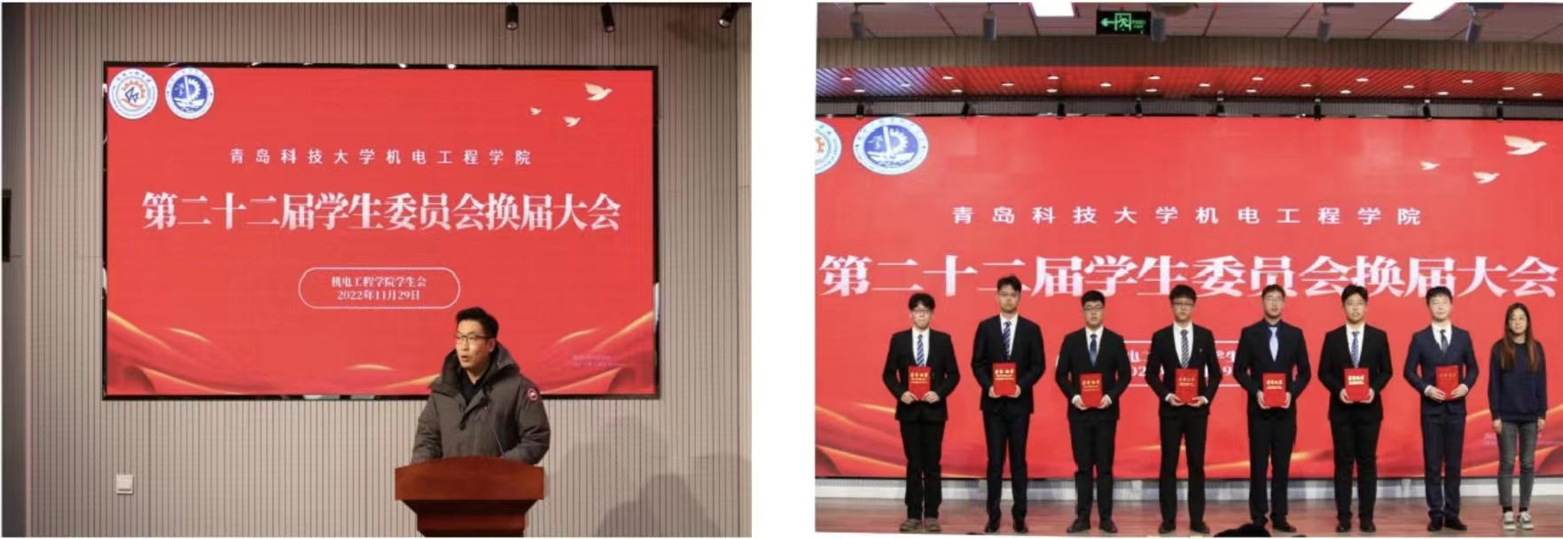 机电工程学院团委王玉凯老师宣读《关于表彰2021—2022年度766全讯白菜网机电工程学院优秀学生干部的决议》。李慧敏为优秀学生干部颁发证书,学院学生会指导老师胡福超宣读了《关于聘任766全讯白菜网机电工程学院第二十二届学生会委员会主席团、各部门负责人的决定》,并为新一届学生委员会主席团、各部门负责人颁发聘书。