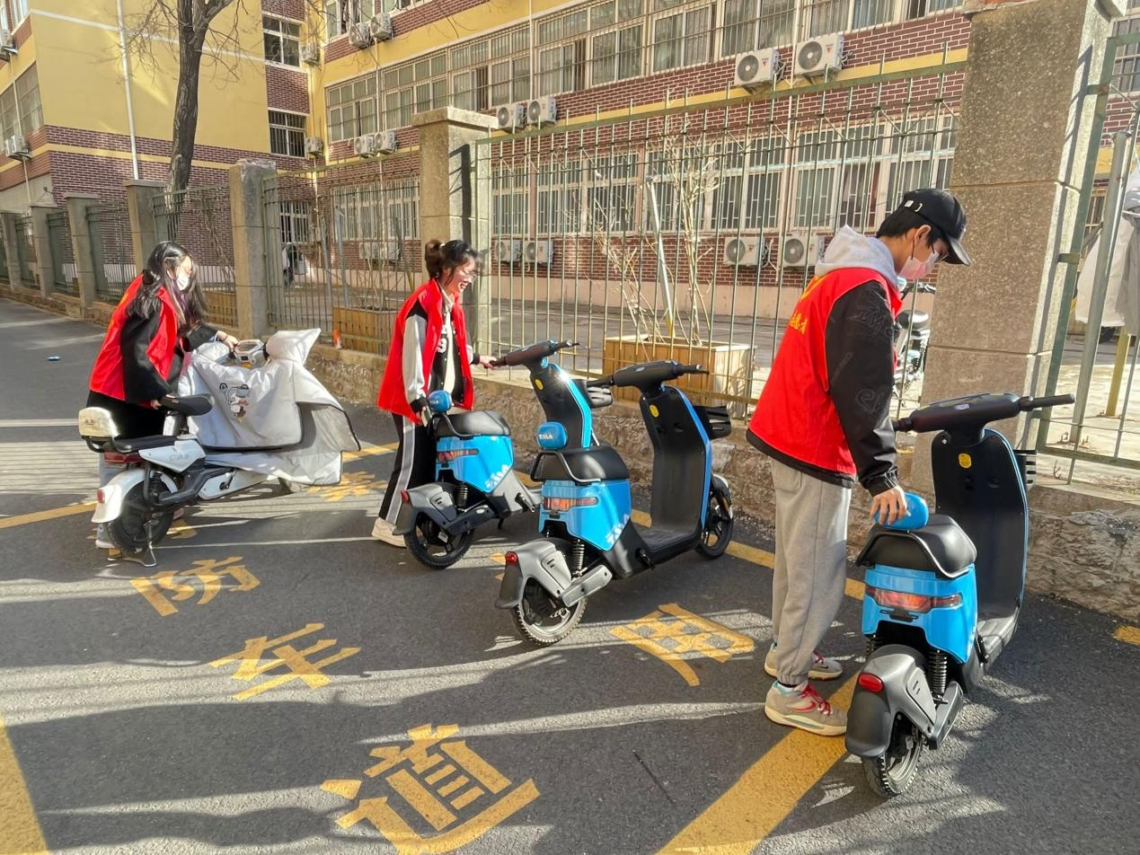 化工学院组织开展“让共享电车回家”雷锋精神公益活动。同学们统一穿着志愿者服装,将乱停乱放的电动车运送回指定区域,在校园的电动车停放点对电动车进行整齐摆放,通过志愿服务为同学们提供干净整洁的校园环境,切实将“为人民服务”思想落实于实处。