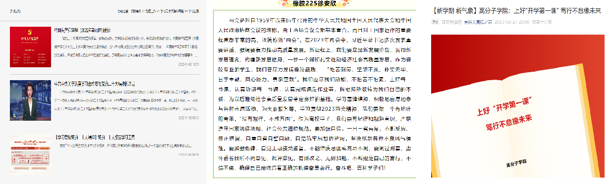 坚持宣传引导相促进,“立体化”学习求真务实。学院组织全体团员青年,通过“网络化倡学+新媒体拓学”形式,以“学习践行二十大,笃行不怠橡未来”为主题,开展学习宣传党的二十大精神”系列活动。依托学院网站、“高院之声”微信公众号等,通过学习“党的二十大报告原文、报告金句、党的二十大报告学习笔记”等内容,引领团员青年认真读、反复学,进一步领会和把握党的二十大精神实质和丰富内涵。