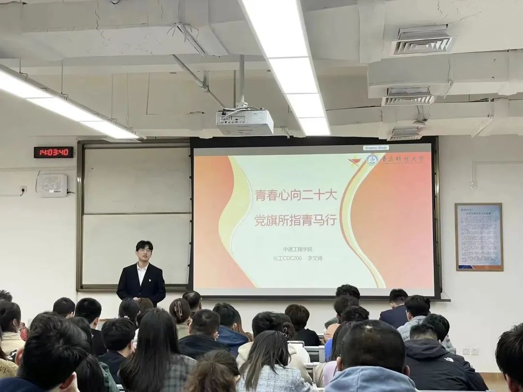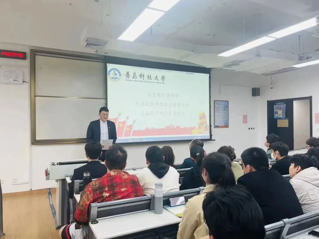 为深入学习宣传贯彻党的二十大精神,落实习近平总书记关于青年工作的重要思想,充分发挥“青马工程”学生骨干的示范引领作用,教育引导青年学生增强“四个意识”、坚定“四个自信”、做到“两个维护”。4月11日下午,中德校区在J308教室举办“青马工程”学生骨干培训班暨党的二十大精神专题培训会。中德校区团委副书记王天乙、学生会指导老师李林、学校传新科大宣讲团成员、中德工程学院2020级辅导员孙安琪老师以及学生会、社团、班级骨干代表共计120余人参加此次培训。