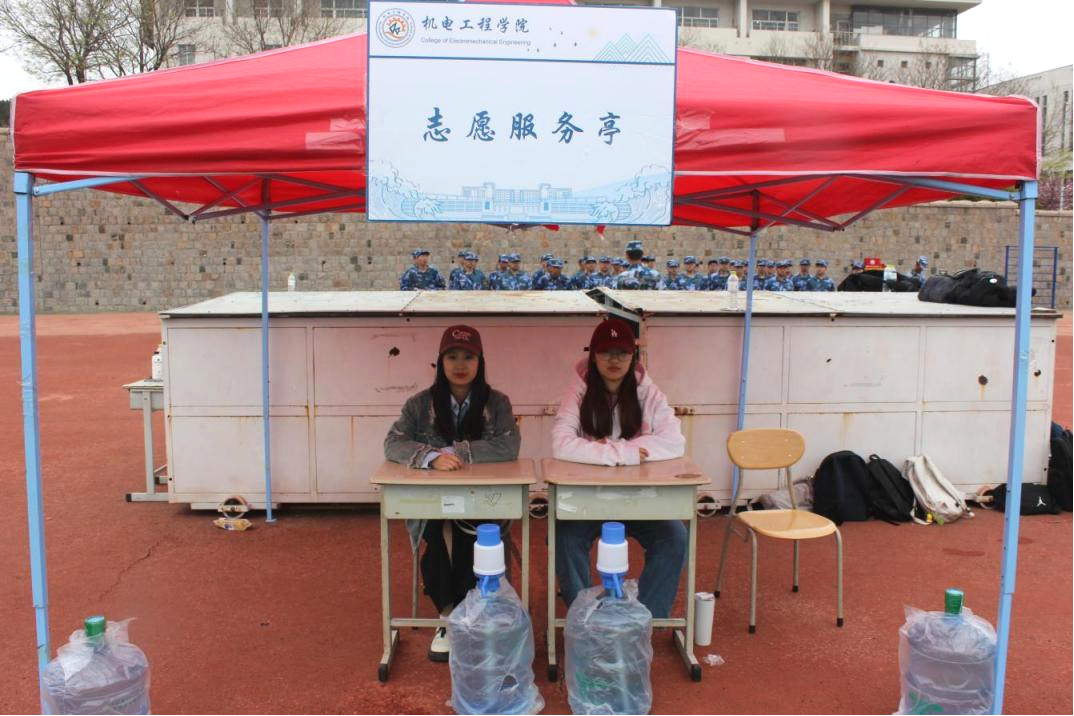 军训期间,机电学院团委在训练场上开设志愿服务点,志愿者们每天按时到岗,轮流值班,为军训同学免费提供饮用水,时刻关注着军训突发情况,有问题及时解决,有事情及时处理,一旦发现有身体不适的同学,立即将其送至医疗点,及时就医,为正在军训的同学们保驾护航。