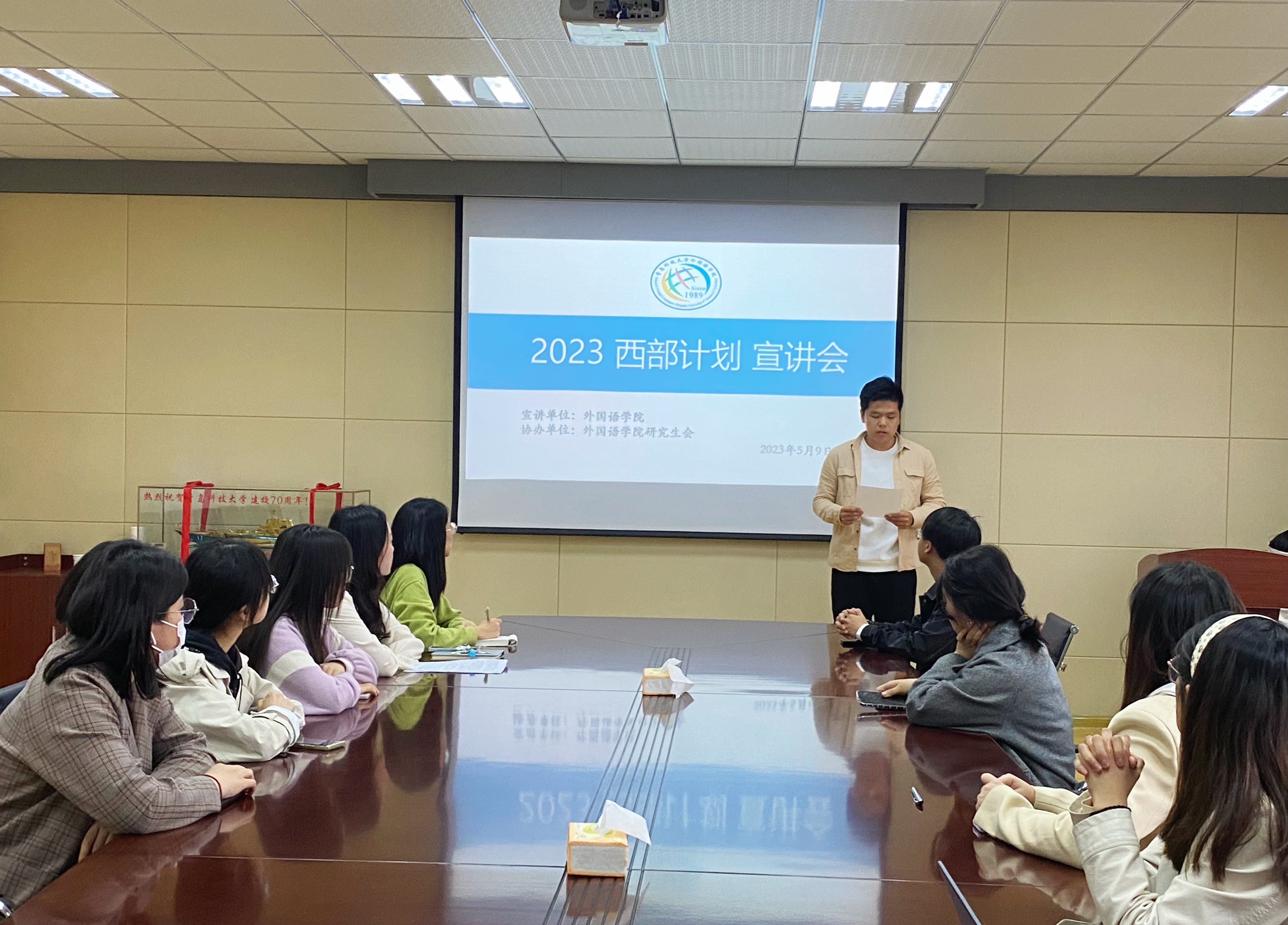 青年当有志,立志为四方。为贯彻落实党的二十大精神,鼓舞全体青年学生感恩回馈社会,增进同学们对国家西部计划的理解,解答大家的疑惑,外国语学院团委于5月9日晚在外国语学院楼517室举办“西部计划”主题宣讲会。本次宣讲会邀请2022届西部计划志愿者巴艳·多合特尔别克、766全讯白菜网第二十三届研究生支教团成员王启真主讲,外国语学院研究生会王潼潼主持,学院部分本科生和研究生参加。