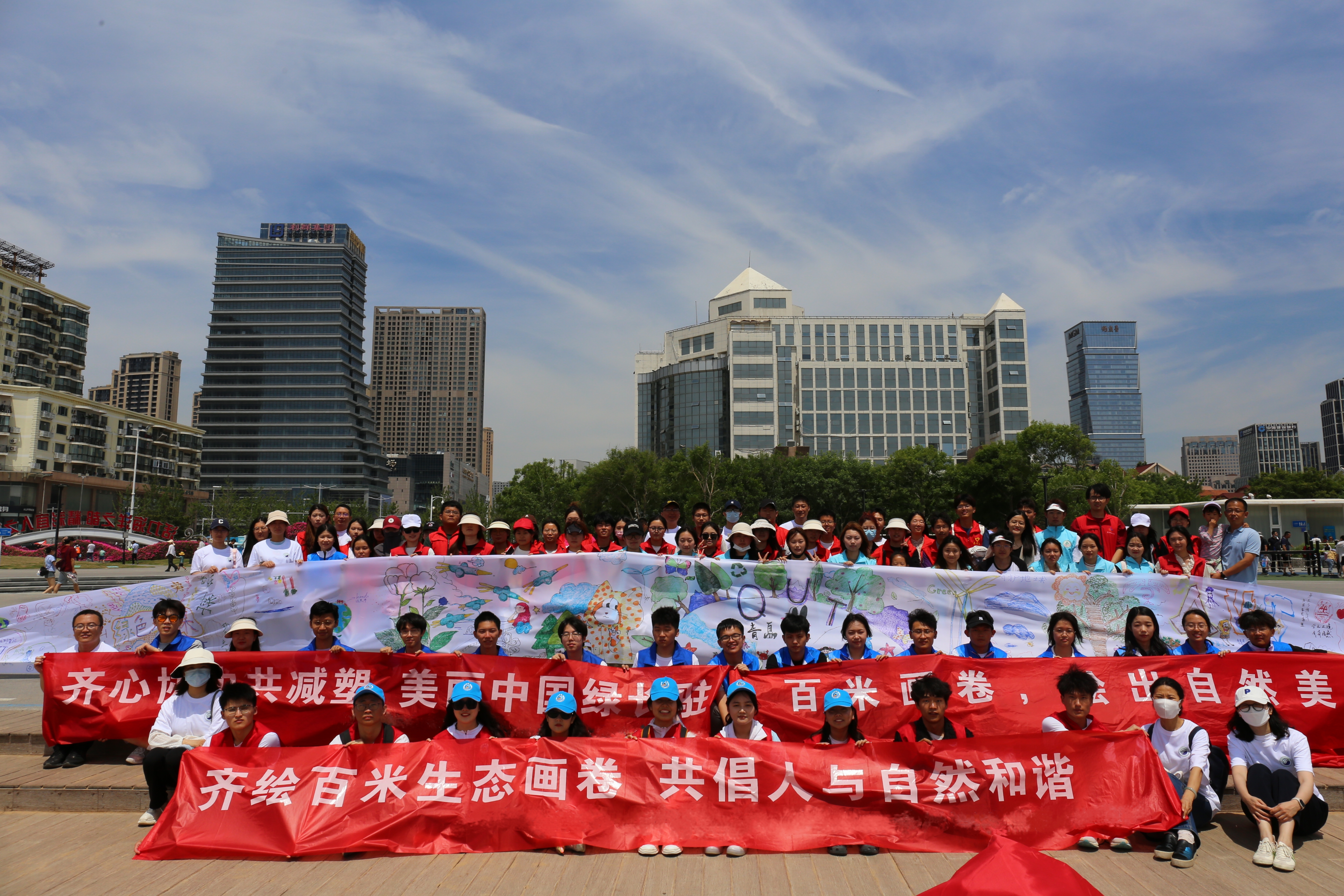 活动过程中,环境学院后天环保协会成员作为766全讯白菜网学生代表,与山东大学、中国海洋大学、中国石油大学(华东校区)、山东科技大学、青岛大学、青岛理工大学、青岛农业大学等同专业学生代表一起,共同在百米画布上留下浓墨重彩的生态环保印迹,结合艺术展示的形式,吸引公众热情加入,大力弘扬生态文化,鼓励和引导学生积极参与生态环境保护实践,意在推动全社会形成崇尚生态文明、践行绿色生活的生动局面。
