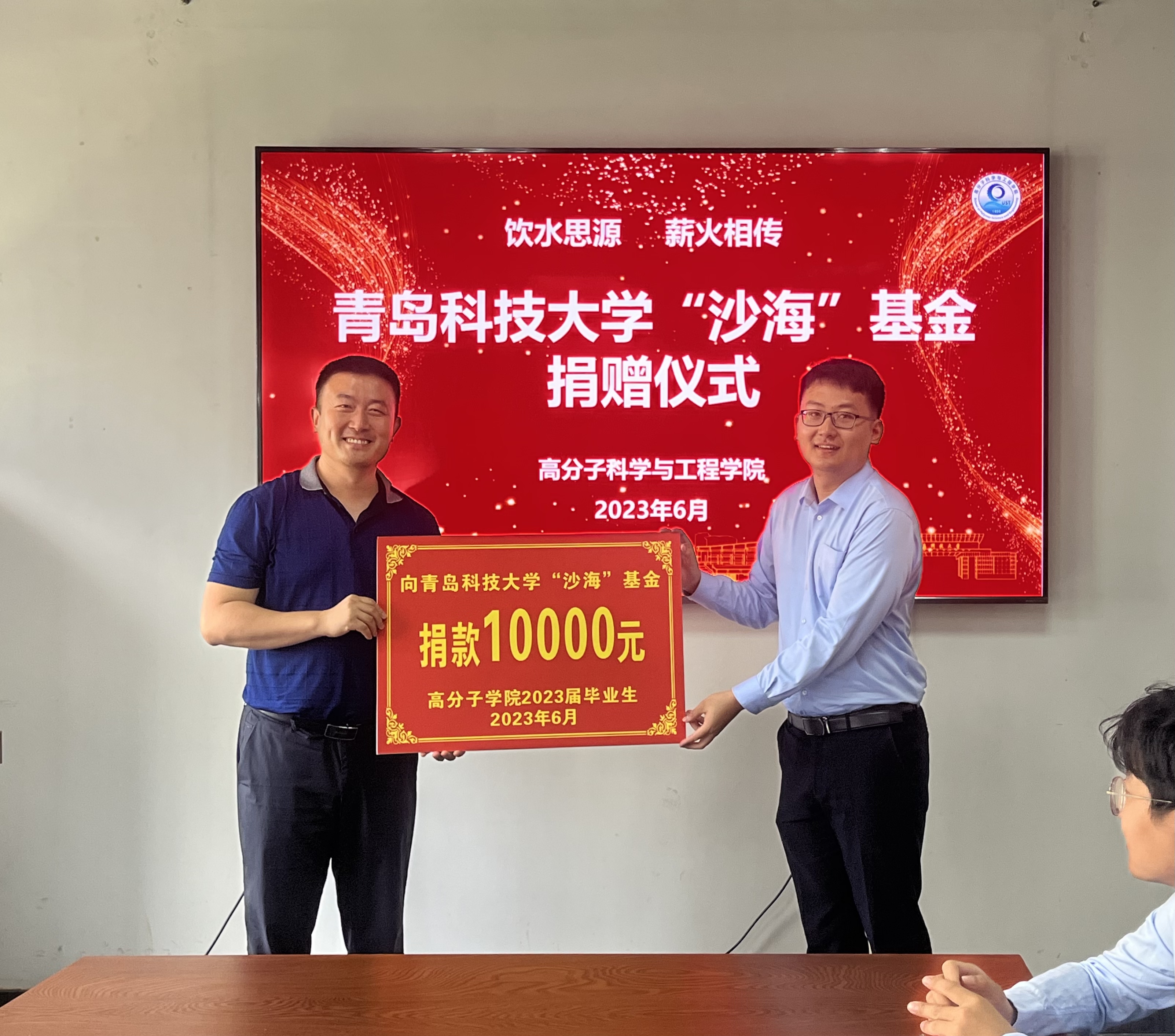 为深入推进习近平新时代中国特色社会主义思想学习,增强毕业生们的社会责任感,提升服务意识和奉献意识,6月21日上午,高分子学院在学院楼403会议室举办“沙海”基金捐赠仪式。高分子学院院长闫业海、党委副书记兼副院长尤亭亭,以及部分毕业生代表参加了本次活动。校团委副书记陈兵代表“沙海”基金接受捐赠。