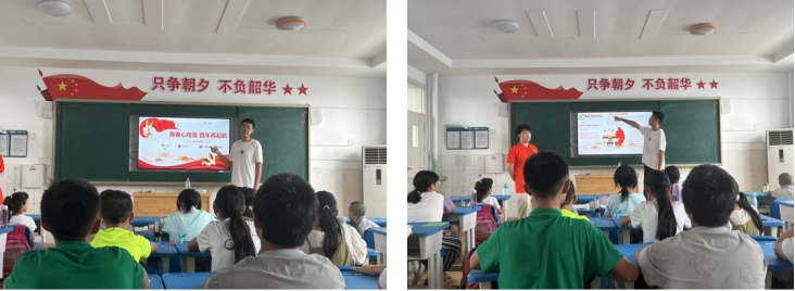 首先开展的是科学知识宣讲活动,以此来启发少年儿童科学素养,拓宽少年儿童科学知识面。就夏季降温方式、中暑预防措施及原理与学生们互动,帮助他们学习了解必备生活常识及背后的科学原理,激发他们对科学真理的好奇心,培养他们独立思考的能力,同时,在课堂上鼓励同学们积极发言,培养他们的自信心以及学习主动性。实践队员用精心的准备为学生们呈现一场别开生面的科学知识宣讲,以真挚的热情呵护他们对学习的渴望,在他们心中埋下一颗求真务实、探求科学真理的种子。