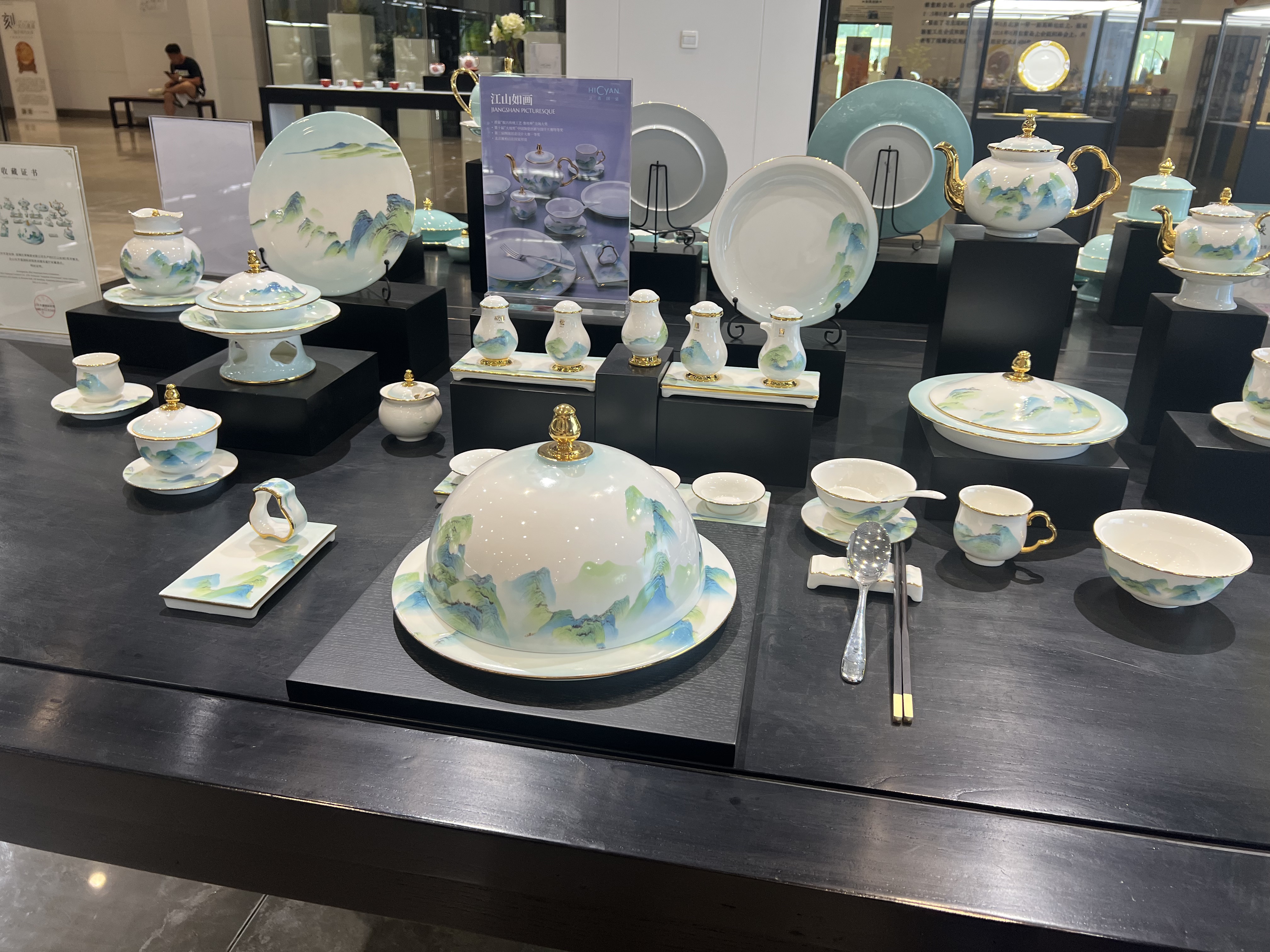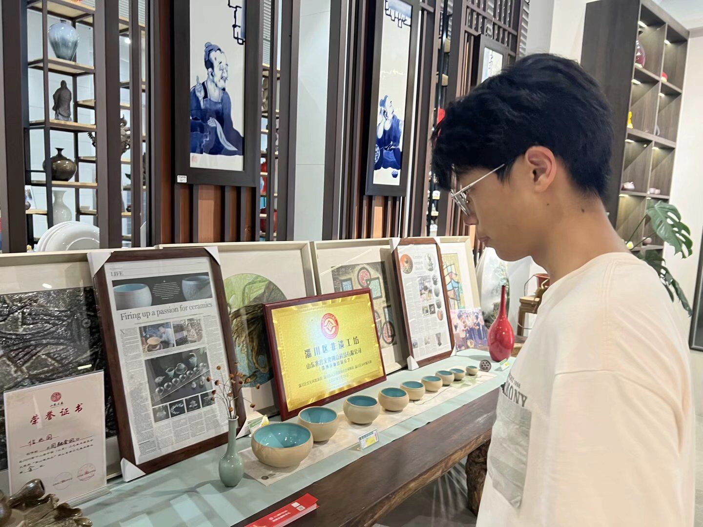调研团漫步在展馆的长廊中,精美的工艺品,雕花烤蓝,弧度的轮回之间构造一份匠人完美的心血。陶器在灯光的映射下温润湖水蓝荡漾开,彰显着东方独有的碧色温婉。最后在展馆调研团来到琉璃小展品售卖出,即使是最小的小工艺品,在阳光的照射下也能晶莹剔透,散发着中式特有的工艺美。