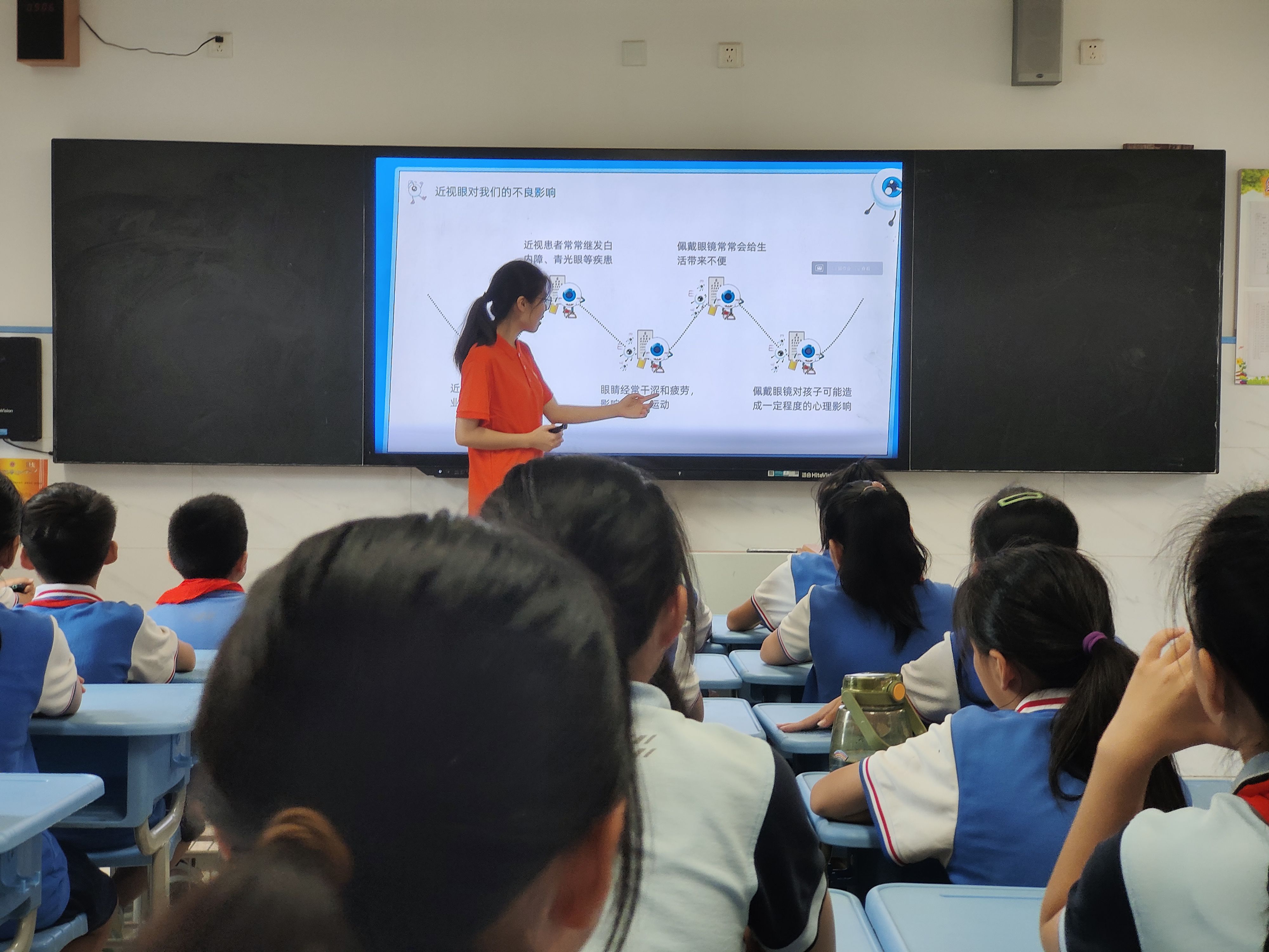 随着科技的迅猛发展,青少年对电子产品的使用越来越频繁,视力健康问题日益凸显。关爱团成员刘倩针对视力健康问题,带领小朋友们学习与保护视力。首先,刘倩通过抛出问题的方式,让小朋友们思考眼睛的作用,小朋友们积极思考,踊跃回答。然后,刘倩通过生动的动画展示了近视形成的原因,帮助小朋友初步了解有关眼睛的生物知识。最后,刘倩通过分析影响近视的因素,对预防近视提出了三条合理建议,提醒小朋友们在日常生活和学习中端正坐姿,保持好的姿态学习,合理使用眼睛,注意劳逸结合,保护好自己的眼睛。
