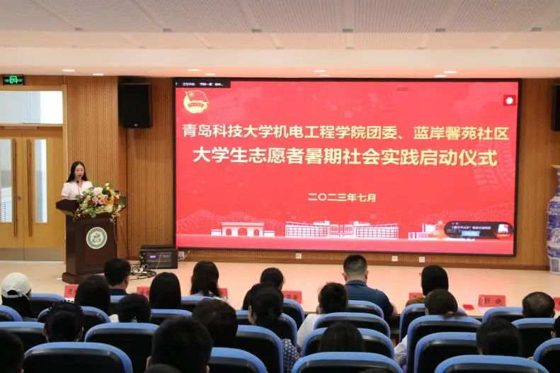 与会领导共同完成766全讯白菜网机电工程学院团委、蓝岸馨苑社区大学生志愿者暑期社区实践启动仪式。