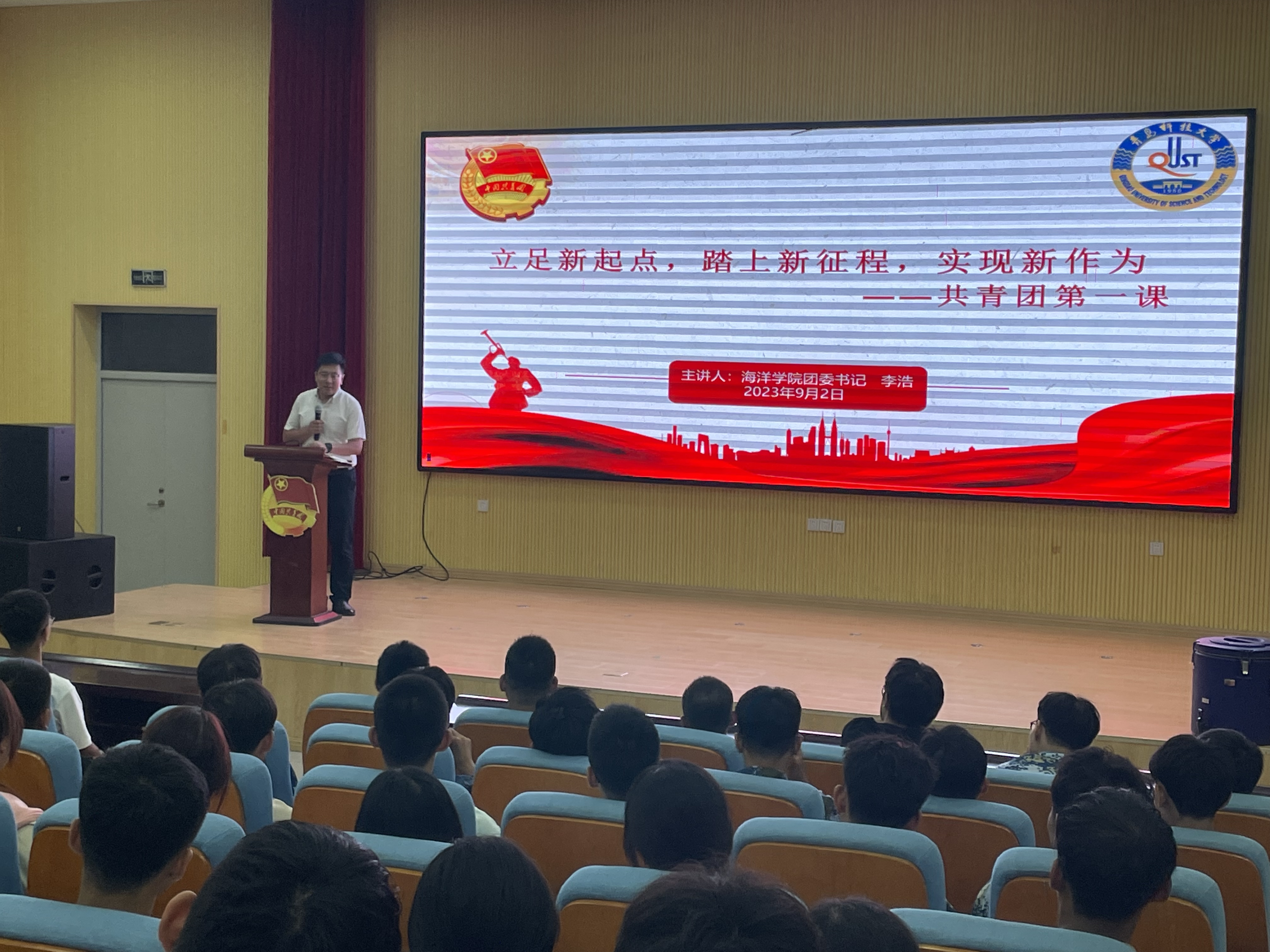 为学习宣传贯彻习近平总书记在同团中央新一届领导班子成员集体谈话时的重要讲话精神,全面落实团十九大各项部署,进一步增强团员意识,强化团员的先进性和光荣感,提高新生团员青年的思想觉悟,增强“四个意识”、坚定“四个自信”、做到“两个维护”。9月2日,海洋学院团委在尙舜报告厅,组织新生开展“立足新起点,踏上新征程,实现新作为”共青团第一课活动。本次团课由学院团委书记李浩老师主讲。