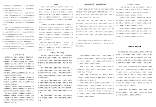 山河披锦绣,盛世撰华章。在国庆来临之际,材料学院发动广大学子以“山河披锦绣,盛世撰华章”为主题征集征文。此次征文得到了同学们的积极投稿,同学们纷纷挖掘个人亲历、亲闻、亲见或所思、所感、所悟的真人真事,抒发了对党、对祖国、对中华民族、对家乡的热爱。身为新时代的青年,同学们表达了自己对于未来的向往,树立了远大志向,在青春的赛道上跑出最好的成绩,为中华民族的伟大复兴贡献自己的青春力量。