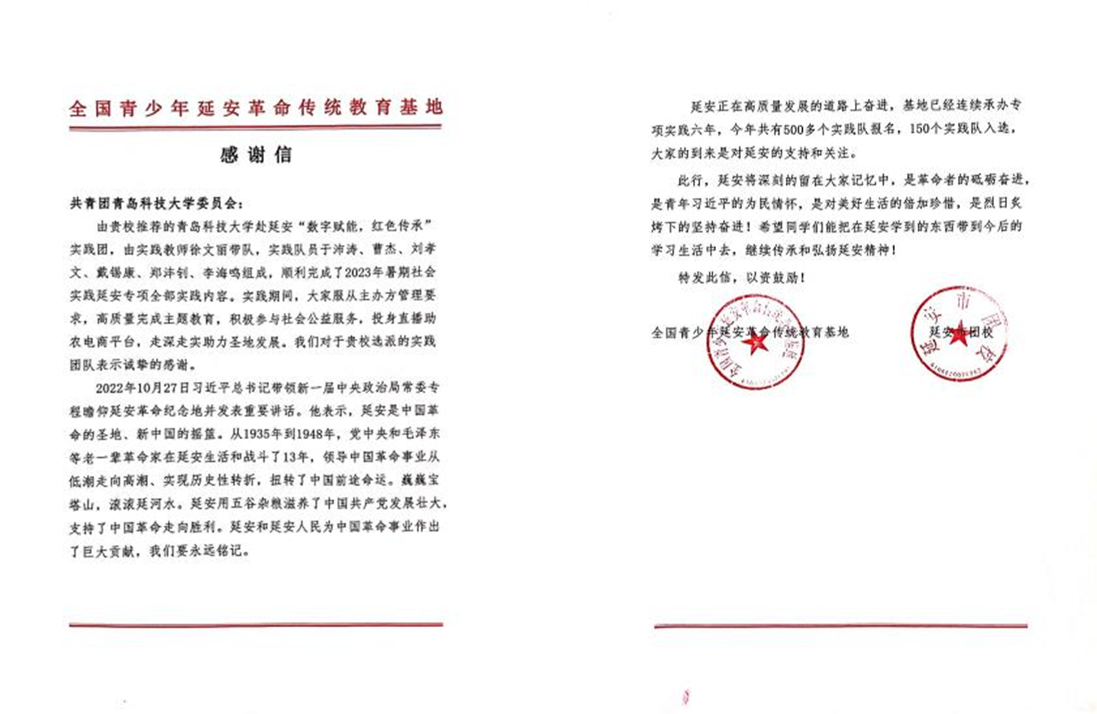 近日,全国青少年延安革命传统教育基地、延安市团校向我院“数字赋能,红色传承”实践队发来感谢信,对我院给予2023年999策略白菜手机论坛生延安暑期社会实践专项活动的大力支持以及实践队青年师生助力圣地发展表示衷心的感谢,同时对我院暑期社会实践队在实践过程中的表现予以充分肯定。