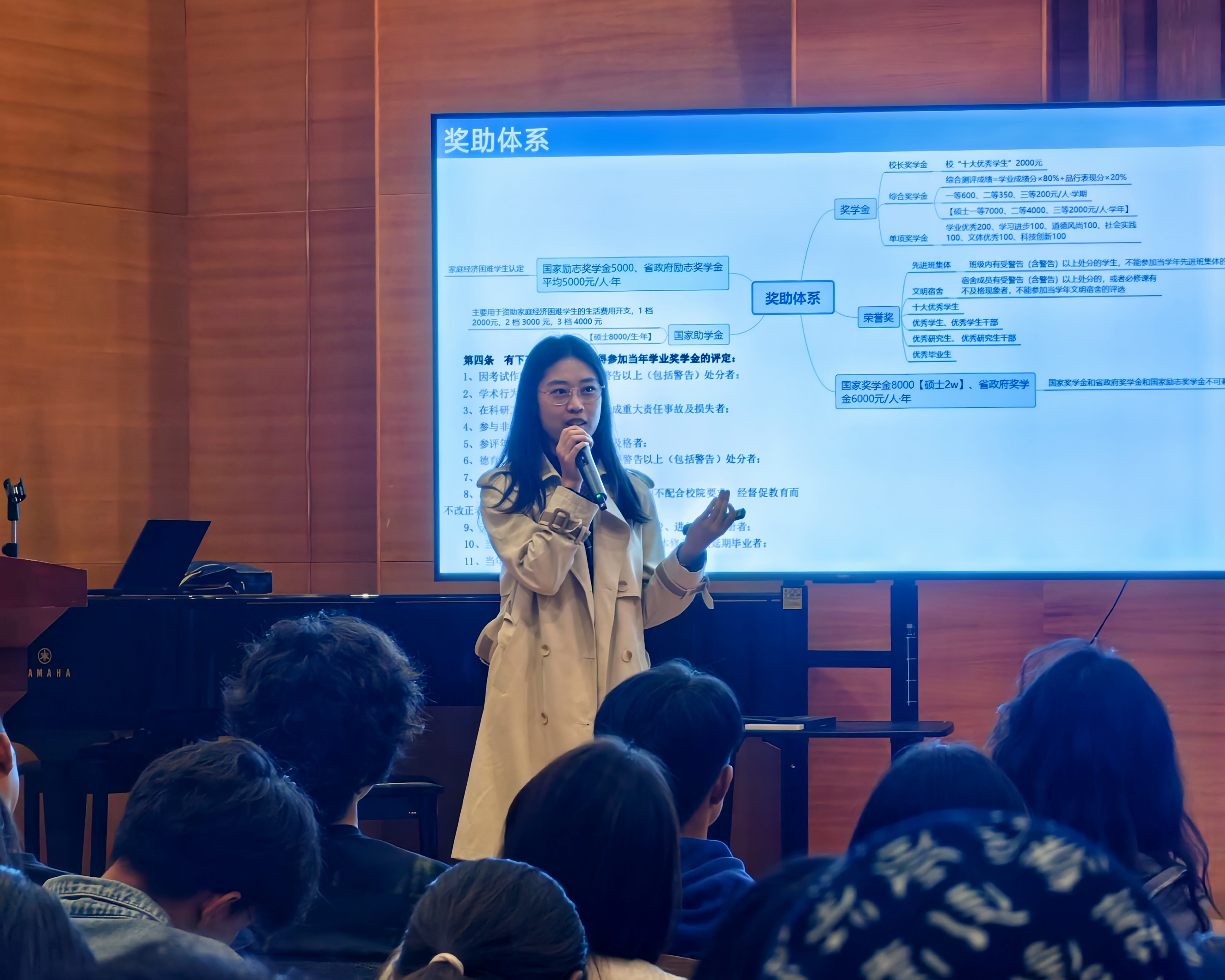 聂楠竹以“助人·筑梦——资助政策与评奖评优”为主题,讲解了获得奖学金和荣誉奖的条件以及评分细则以及资助或贷款项目、对象、标准以及流程,鼓励全体学生干部学习、工作同步发展。