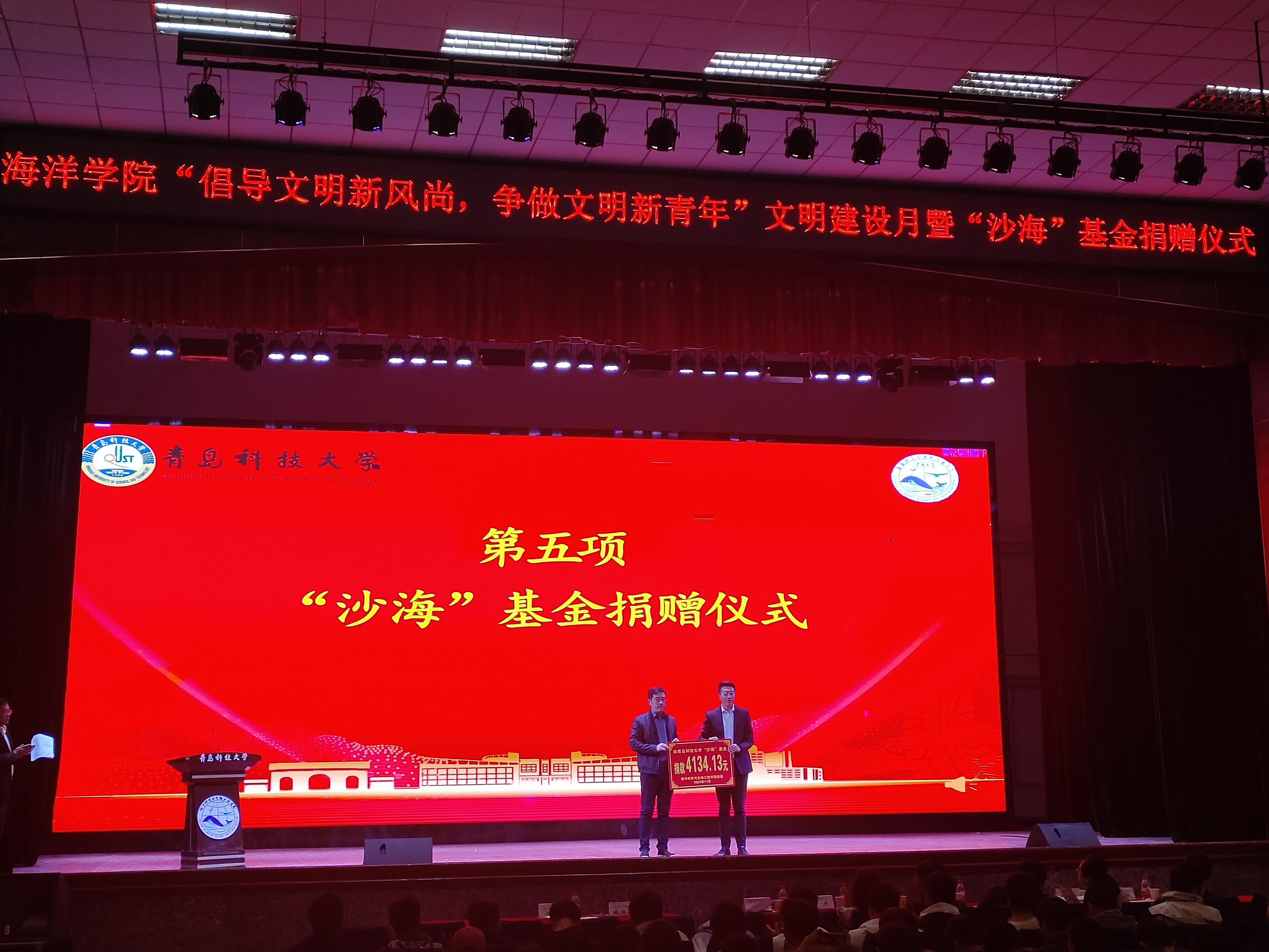 为增强学生们的社会责任感,提升服务意识和奉献意识,11月7日上午,海洋学院在西礼堂举办“沙海”基金捐赠仪式。海洋学院党总支书记周宪锋、党总支副书记兼副院长臧传永,副院长李昉以及全体在校生参加了本次活动。校团委副书记李航代表“沙海”基金接受捐赠。