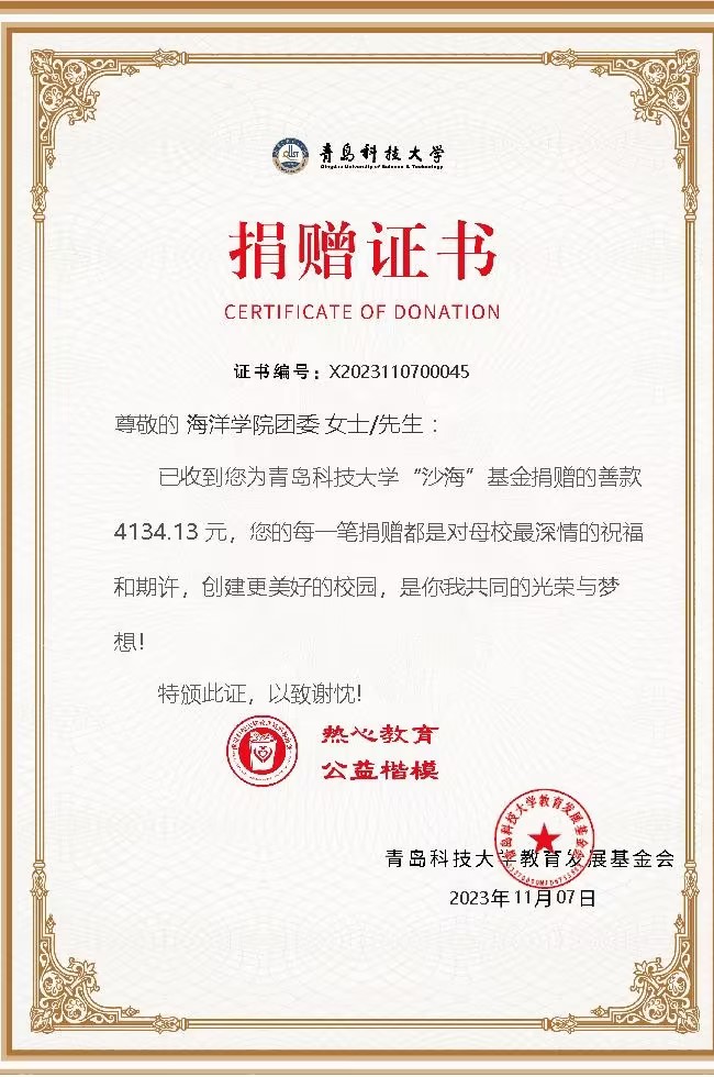 海洋学院积极支持西部教育事业,教育引导青年学生勇于担当,情系西部,用实际行动支援西部建设。2017年以来,先后有2名同学积极参加研究生支教团,志愿到祖国最需要的地方贡献自己的力量。今年,海洋科学专业2024届毕业生牛鑫宇通过层层选拔成功入选研究生支教团,学院团委向全院学生发出了关于捐赠“沙海”基金的倡议,积极组织、广泛动员同学们奉献爱心,最终合计向“沙海”基金捐资4134.13元。此次捐赠活动,充分展示了海洋青年学生以自身的实际行动助力西部学子圆梦,投身西部志愿服务,展现科大学子的青春担当。