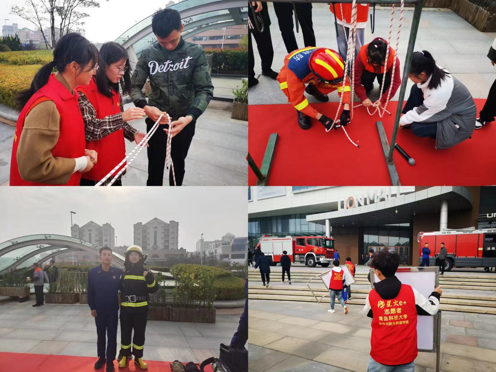 上午,信息学院志愿者在保卫处消防科指导老师的带领下来到崂山区金狮广场。志愿者在指导老师的和现场工作人员的带领下搬运了活动物资、亲身穿戴体验了消防服,学习绳结的系法。在活动开始之后,志愿者向市民们宣传消防安全知识,提醒广大市民冬季火灾多发,切实做好冬季防火工作。志愿者的积极作为和主动奉献精神获得了市民与消防战士们的一致肯定。