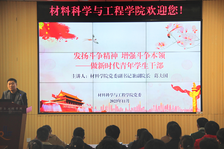 为深入学习贯彻习近平总书记关于青年工作的重要思想,进一步深化实施青年马克思主义者培养工程,提高团干部的文化素养、研究能力和实践水平,坚定团干部走中国特色社会主义道路的理想信念。11月14日,材料学院团委于材料楼101举办材料学院2023-2024学年“青马工程”培训班开班仪式暨开班第一课。材料学院党委副书记兼副院长葛夫国、学工办主任兼团委书记薛蓉以及各年级辅导员出席活动,材料学院全体学生干部参会。