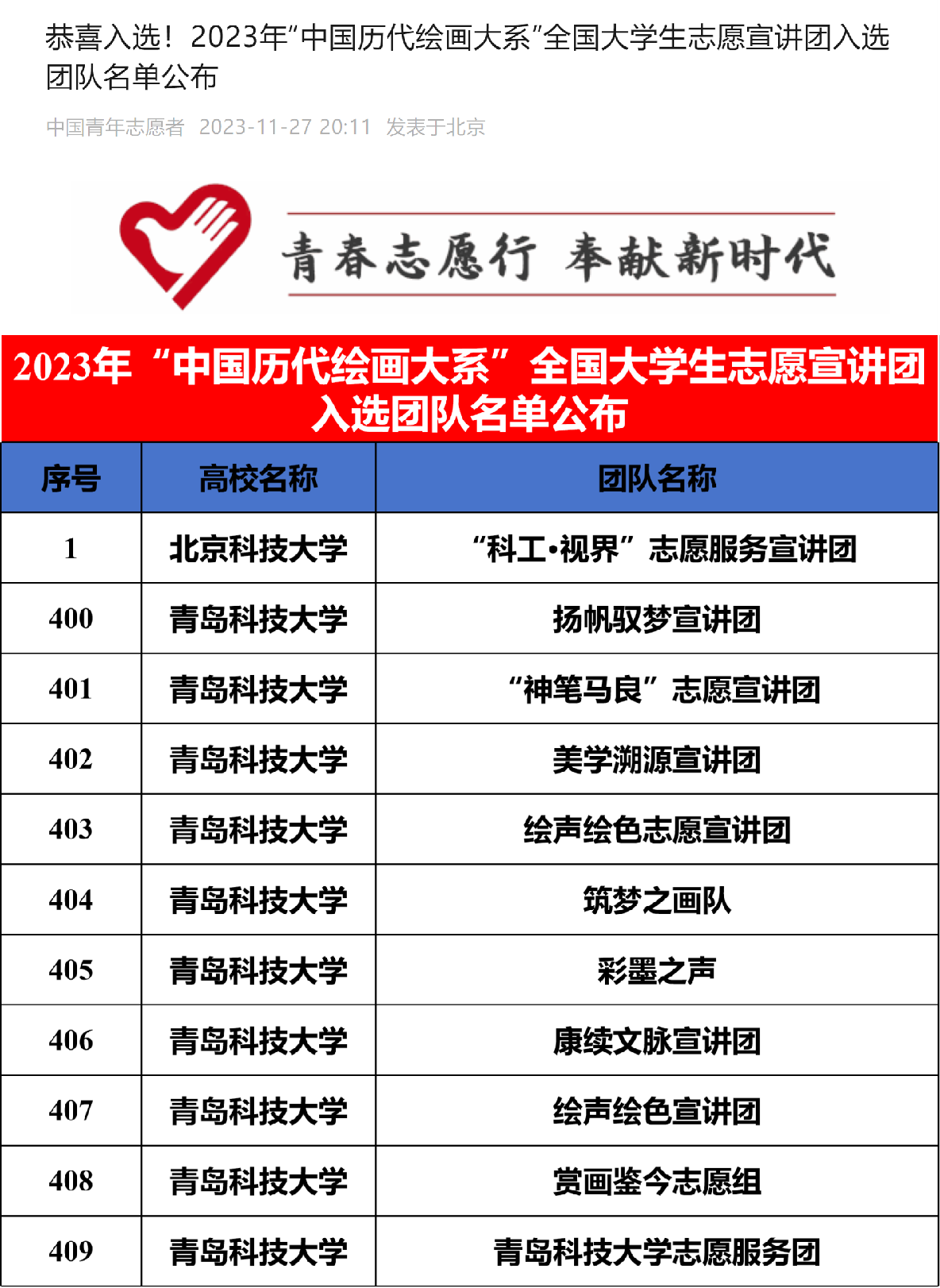 化工学院刘乙鸣同学负责的“神笔马良”志愿宣讲团、崔浩然同学负责的美学溯源宣讲团、郝迪同学负责的扬帆驭梦宣讲团、杨淑婷同学负责的康续文脉宣讲团、杨予曦同学负责的赏画鉴今志愿组、唐宽硕同学负责的绘声绘色志愿宣讲团、王欣茹同学负责的筑梦之画队、刘晓会同学负责的彩墨之声、姜素珍同学负责的绘声绘色宣讲团、黄文斌同学负责的766全讯白菜网志愿服务团成功入选。