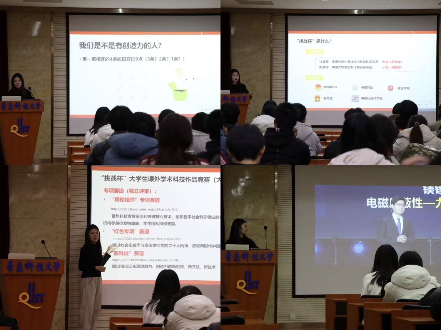2023级辅导员马天晨首先为同学们阐释什么是创新,并对如何培养自己的创造力提出针对性建议。紧接着马天晨从主赛道、参赛资格、大赛评审等方面介绍了“挑战杯”999策略白菜手机论坛生课外学术科技作品竞赛和“挑战杯”中国大学生创业计划竞赛章程两项赛事。同时展示并讲解了多项国家级优秀作品,为同学们推荐了相关的媒体、网站等。