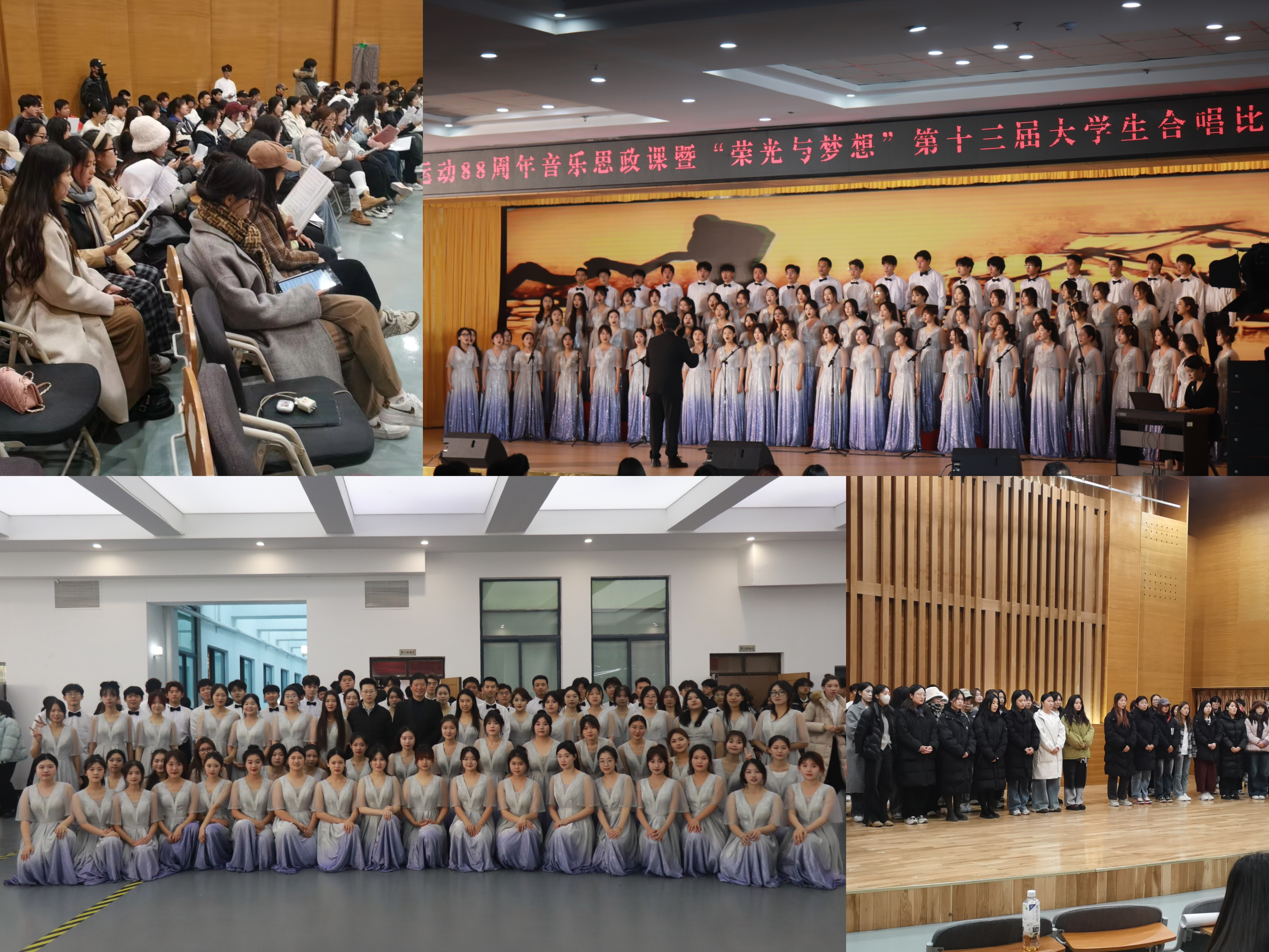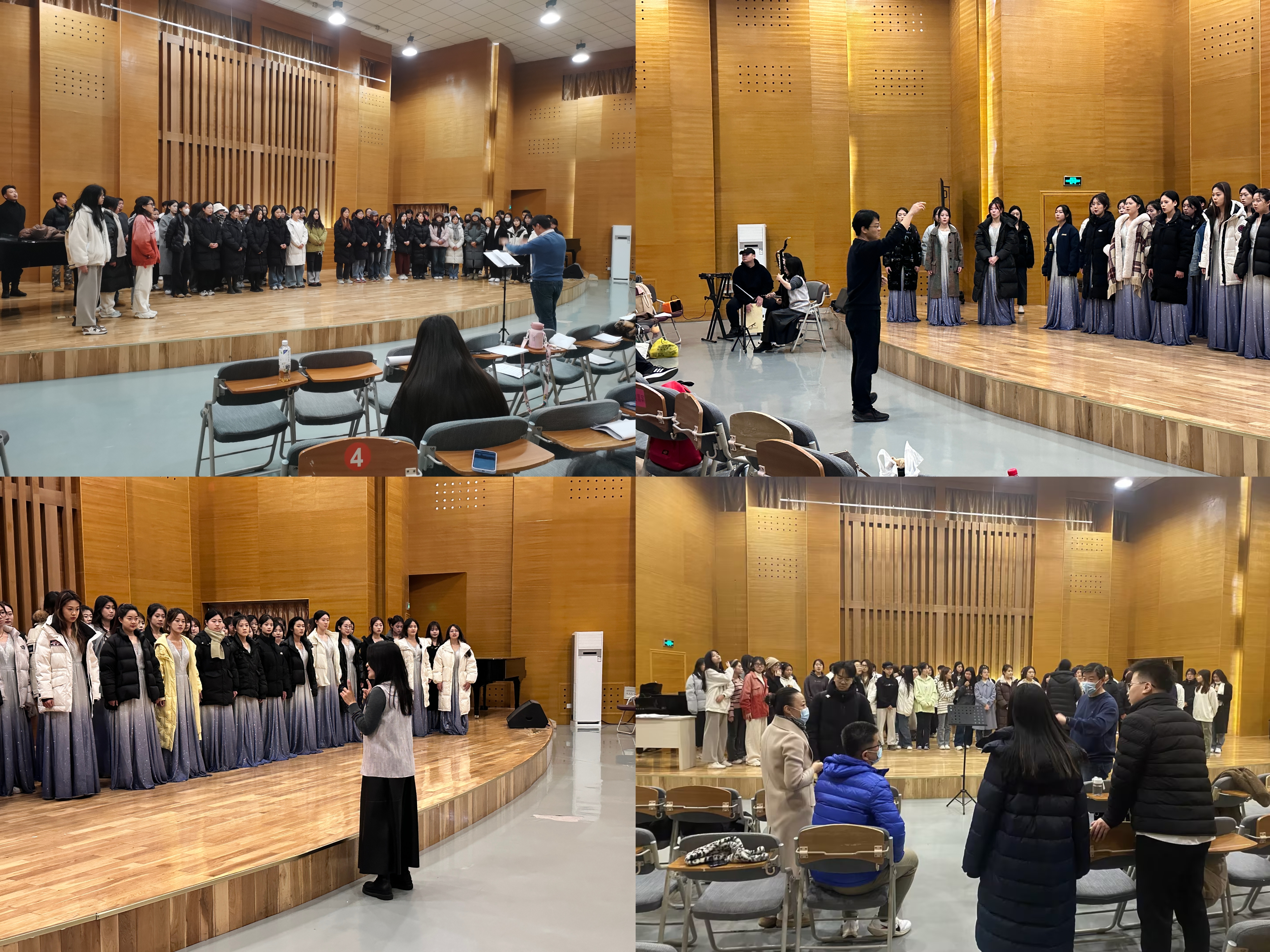 自学校下发本次音乐思政课暨大学生合唱比赛通知以来,学院领导高度重视、精心部署安排合唱工作,学院团委认真落实,成立由音乐系教师、学院团委辅导员和学生骨干共同组成的合唱工作专班,保障合唱工作各项事宜顺利进行。筹备过程中,音乐系副教授刘洋挺膺担当,精心挑选备战曲目《乡谣》,亲自担任指挥,牺牲休息时间参与排练,克服工作任务繁忙、生病发烧等困难,带领合唱团在崂山校区预决赛中取得优异成绩,成功入围学校总决赛。音乐系主任张燕、副主任王邑主动协调排练场地空间,为排练顺利进行保驾护航,从专业的角度提供建议,让合唱节目表演得以不断优化。学院全体专职团干部排班提供组织、协助工作,全程参与。筹备决赛过程中,因刘洋因公出差,音乐系党支部书记李猛在家中孩子发烧的情况下接力指挥,参与排练、决赛。王一平和明辰两位教师携带琵琶和二胡助力,编排乐曲,加班合练,为合唱提供重要支持。历经一个多月的时间,学院7个专业的近90余名师生,齐心协力,全力以赴,在每日近两个小时的排练中,追求完美,不断磨合和精进,最终在舞台上以饱满昂扬的精神状态为全校师生带来一场精彩绝伦的视听盛宴,展示出了艺术人的奋进风采。