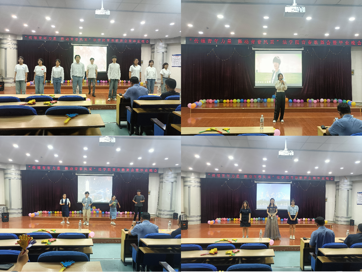 不忘记少年梦,也不曾忘记心中的那片星辰大海。在第三篇章,法学院宣讲团带来朗诵《我走在早晨的大路上》,用声音的抑扬顿挫将文字赋予情感细腻的表达,传递出积极向上的生活态度和对美好未来的无限憧憬;于佩玉演唱的歌曲《再不疯狂我们就老了》唱出了青春匆匆流逝的无奈与哀愁,引发了在场观众的强烈共鸣;法学院第七届学生会带来的部长舞为现场增添了欢快的氛围。最后,2019级学长学姐通过视频形式为2024届毕业生送去了最真挚的祝福,晚会在王皓晨等演唱的《星辰大海》中落下帷幕,在激昂的歌声中表达了对毕业生的美好祝福。