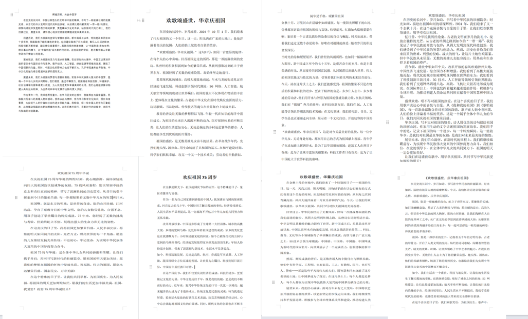 在国庆假期来临之际,材料学院团委发动广大学子以“欢歌颂盛世,华章庆祖国”为主题征集征文。青年学子们纷纷挖掘个人亲历、亲闻、亲见或所思、所感、所悟的真人真事,抒发了对党、对祖国、对家乡的热爱。身为新时代的青年,材料学子表达了自己对于未来的向往,树立了远大志向,为中华民族的伟大复兴贡献自己的青春力量。