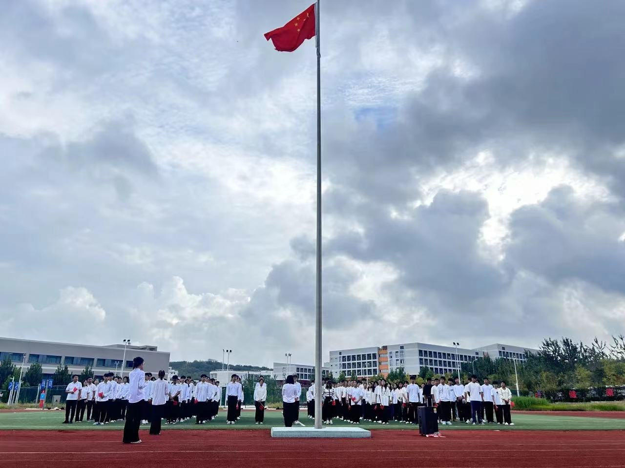 金秋时节,丹桂飘香,为进一步加强爱国主义教育,厚植家国情怀,弘扬民族精神,引导广大青年在推进中国式现代化的进程中贡献青春力量,9月30日清晨,学院团委举行“青春致敬祖国”升国旗仪式庆祝新中国成立75周年,学院团委百余名师生代表参加仪式,随着国歌奏响,五星红旗在晨光中冉冉升起,全场肃立,目光紧随国旗,共抒对祖国的敬仰。