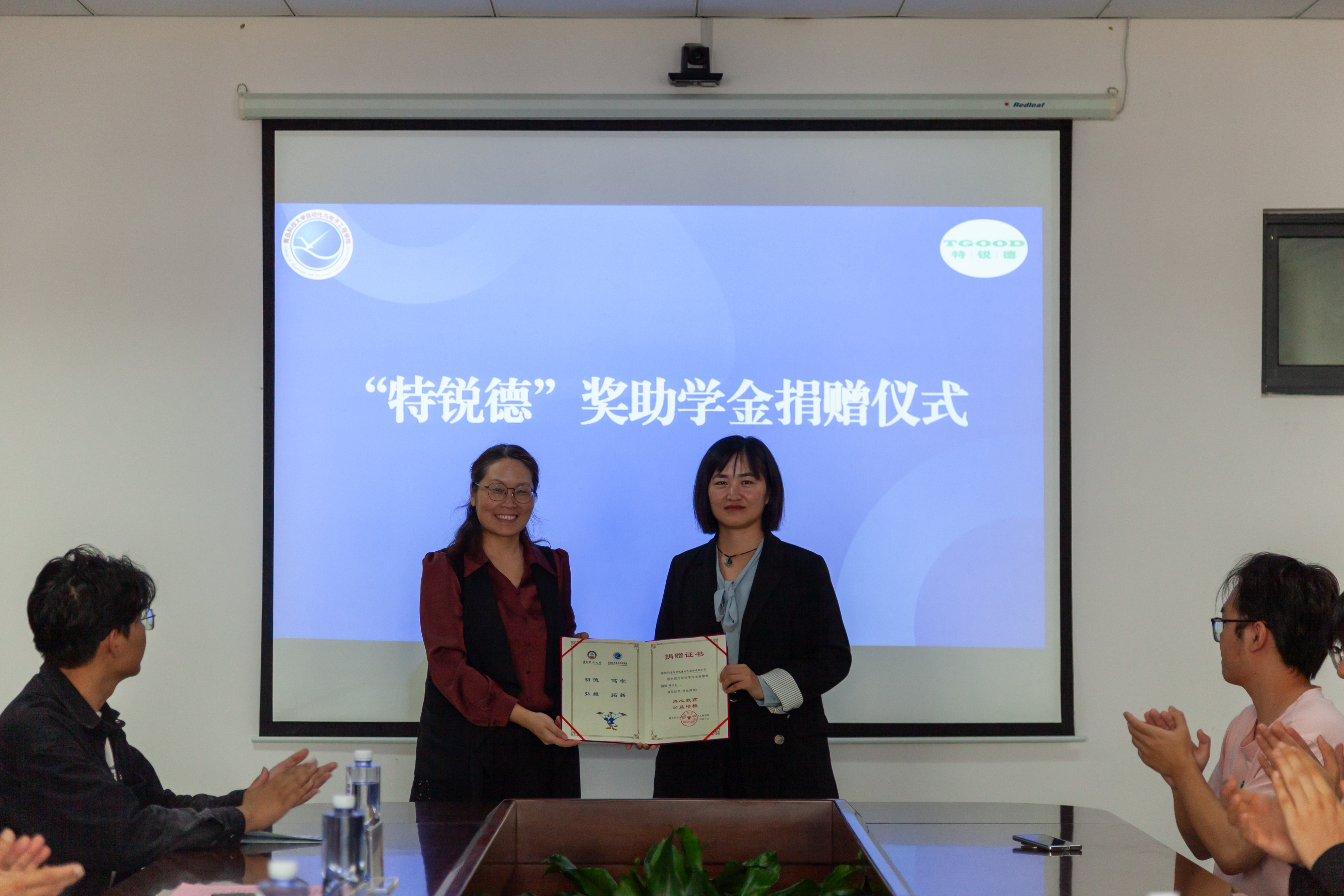 签约仪式上,李卉向韩增雪颁发了捐赠证书,以表达学院对公司的诚挚感谢和崇高敬意。巩敦卫与韩增雪共同签署了“特锐德”奖助学金合作协议,本次签约为双方第二年签约,标志着双方合作迈出了坚实的一步。张莹与刘名森进行了捐赠交接。