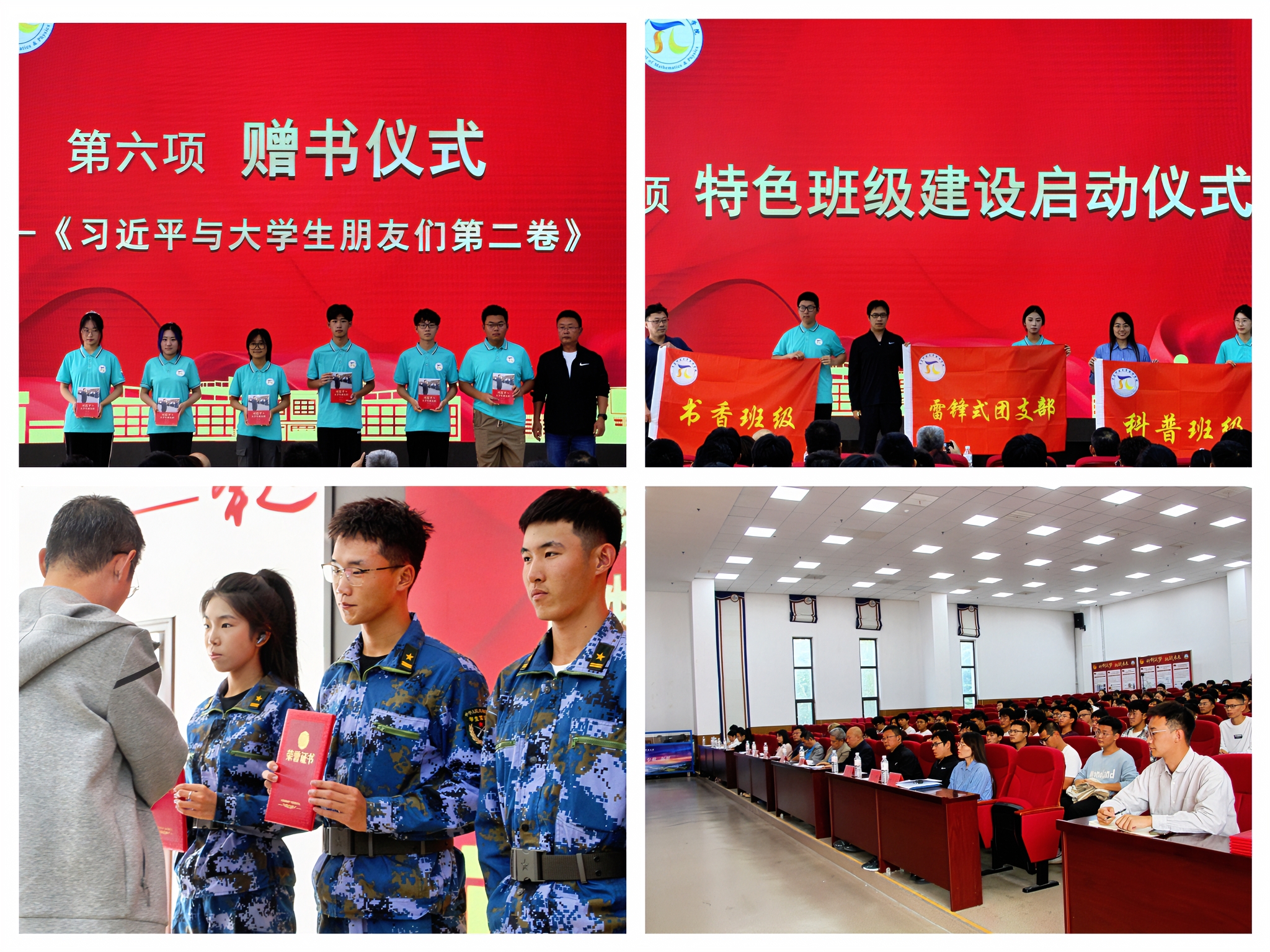 学院副院长王明辉为军训中表现优异的同学颁发荣誉证书。副院长郭广海为各班级代表赠送《习近平与大学生朋友们第二卷》。数学系主任张瑞坤、物理系主任高鹏、学工办副主任付凯为三个本科专业授予书香班级、雷锋式团支部、科普班级旗帜,学院特色班级建设拉开序幕。