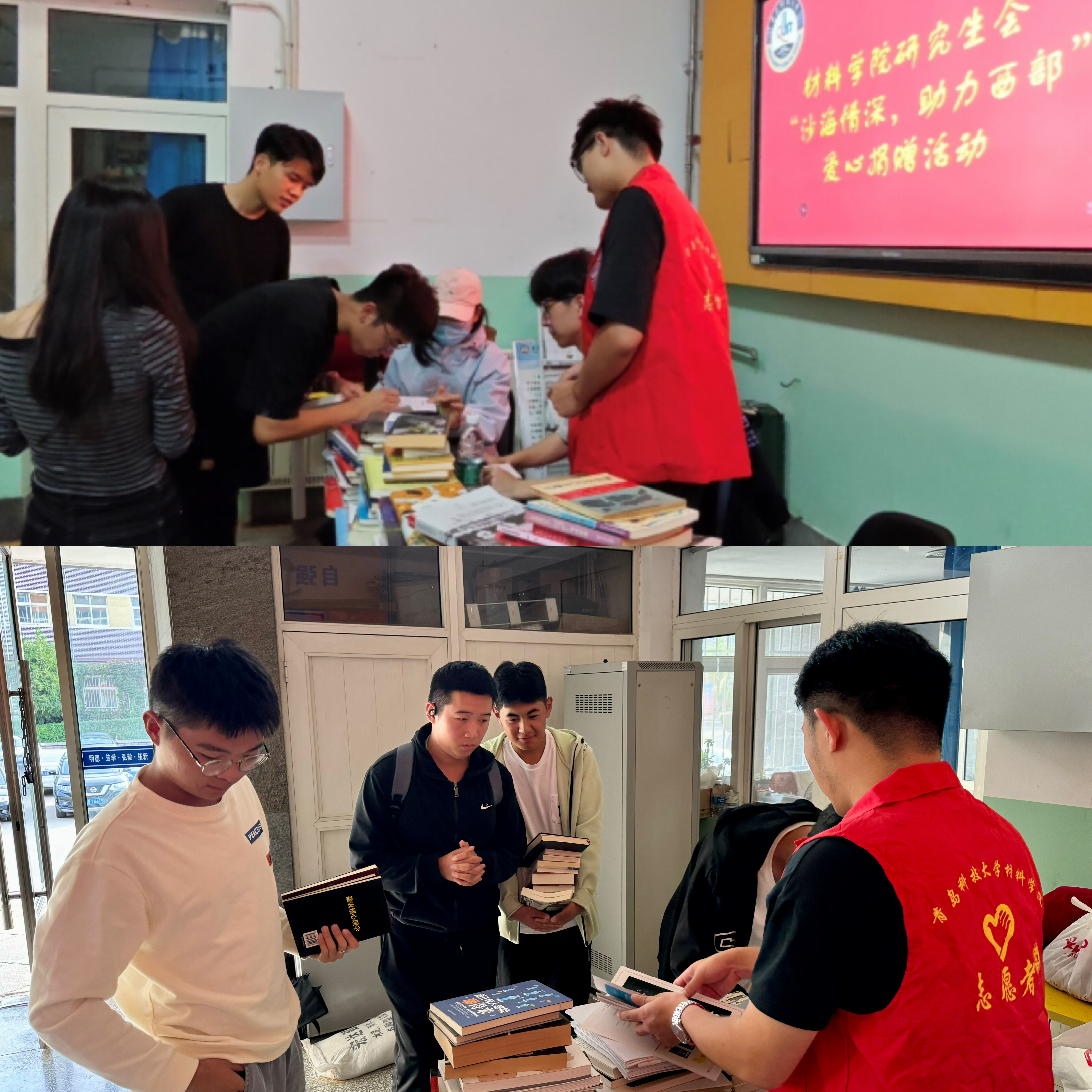 材料学院团委研究生会通过前期问卷调查和新生座谈会了解到:学期结束后,许多青年学生的学科类书目和名著类书籍往往被遗弃或闲置,缺乏有效的二手书平台进行再利用。新生入学时,通常难以找到合适的平台购买价格合理且保存良好的二手学科类书籍。同时许多青年学生有心帮助西部地区的青年学生改善学习条件,但由于缺乏合适的途径和平台,助力行动常常难以落地或影响有限。针对以上问题材料学院团委研究生会举行了“沙海情深 助力西部”图书捐助活动。