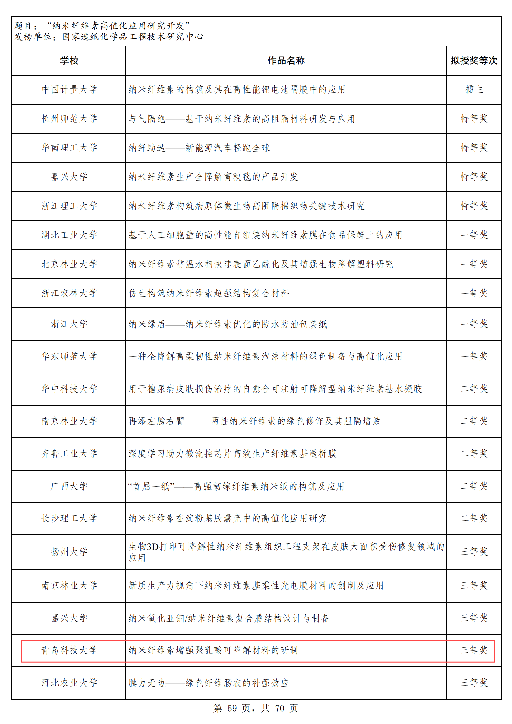 第十九届“挑战杯”999策略白菜手机论坛生课外学术科技作品竞赛2024年度“揭榜挂帅”专项赛终审决赛于11月8日至10日在北京、11月15日至17日在浙江举办。生物工程学院参赛项目——纳米纤维素增强聚乳酸可降解材料的研制(指导教师:王松林、车玉章,负责人:王欣,团队成员:李璇、吴佳慧、王艳华)获三等奖。