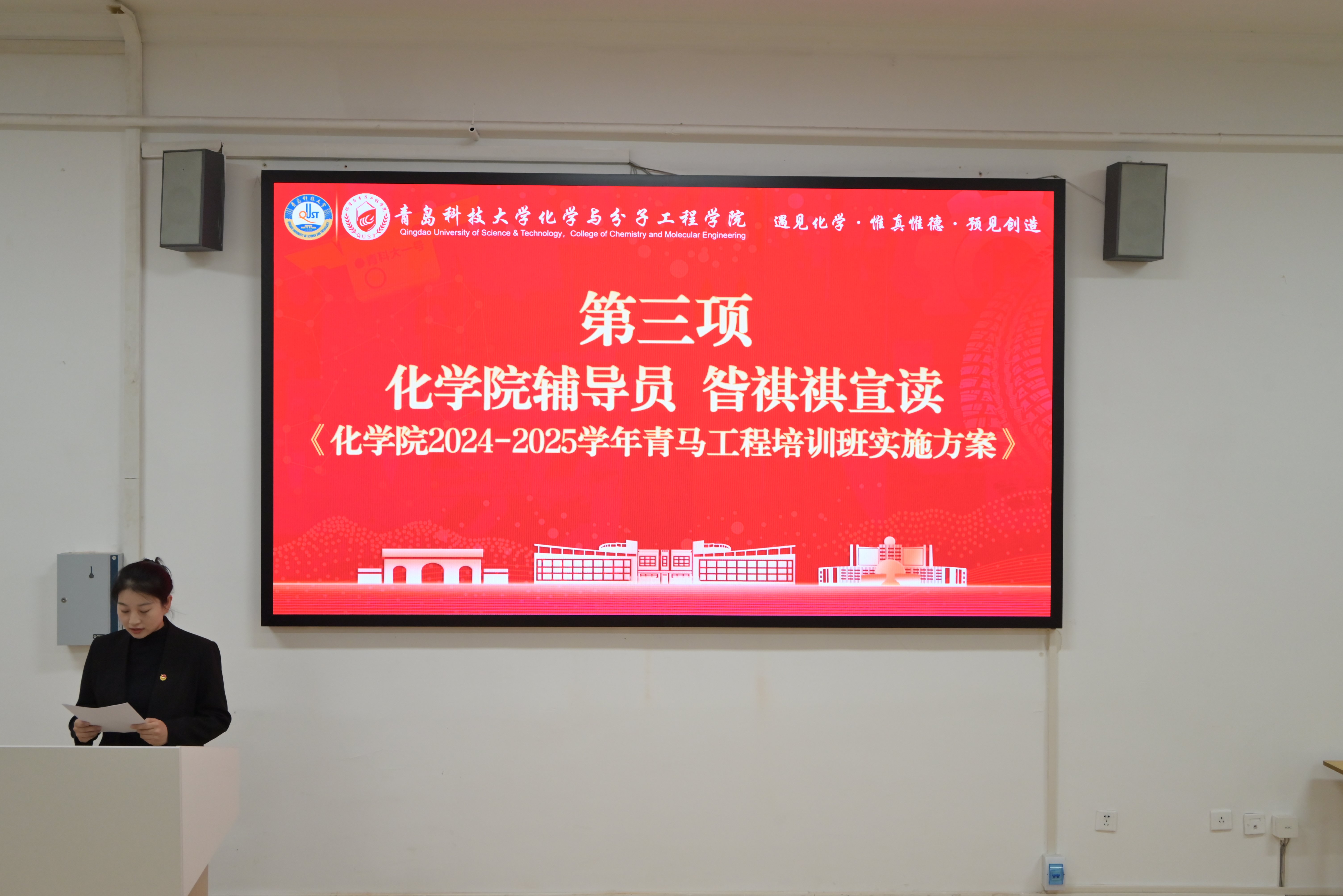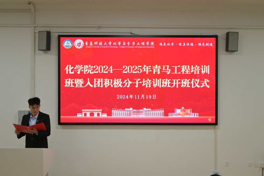 刘尧上台致辞、昝祺祺宣读《化学院2024-2025学年青马工程培训班实施方案》、学员代表上台发言,表达参加培训的决心和信心。