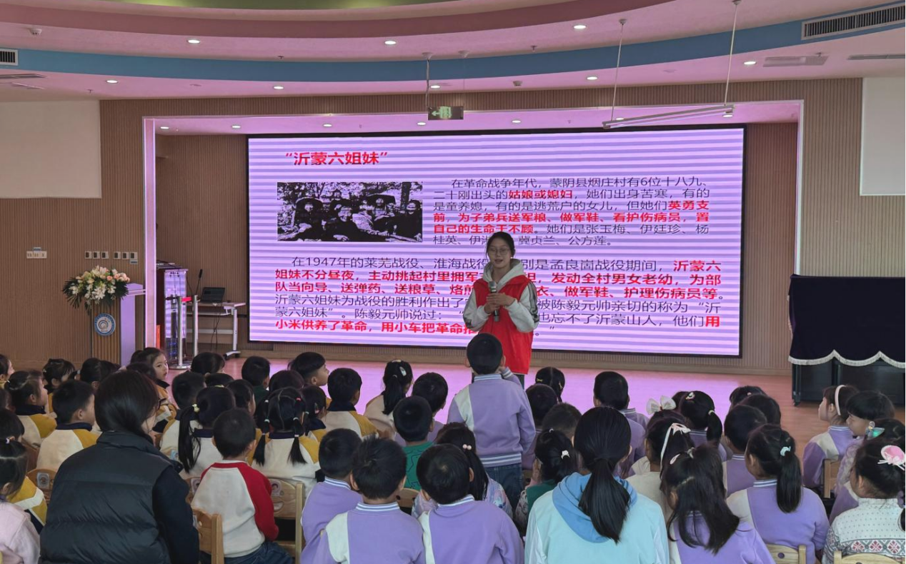 活动中,“编梦沂蒙,童声传颂”和“众心巍峨翠,精神水长流”志愿宣讲团的成员们以饱满的热情和专业的知识,为孩子们带来了一场别开生面的宣讲。宣讲围绕“沂蒙精神”与“科学家精神”两大主题展开,通过生动的语言、形象的比喻以及丰富的互动形式,将革命先烈的英勇事迹、无私奉献以及科学家们的坚韧不拔、不断求知的精神深入浅出地呈现给孩子们。在宣讲过程中,孩子们凝神静听,眼中闪烁着对英雄前辈的敬仰和对科学的向往,这些宝贵的精神财富在他们幼小的心田悄然萌芽。