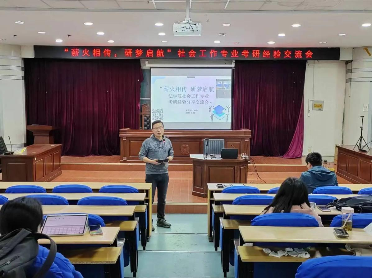 新一届的考研学子们即将踏上备考之路,为帮助同学们认清当前考研形势、明确考研目标、增强考研信心、做好考研规划、完善考研方法,766全讯白菜网青鸟社会工作协会于4月23日下午在弘毅楼A201模拟法庭举办了以“薪火相传、研梦起航”为主题的考研经验交流会。社会工作专业各年级同学积极报名参加,高密校区社会工作专业青年学生也通过线上方式参与活动。社会工作系老师刘琰、张行、杭帆等亲临现场指导,9位考研成功上岸的同学进行具体的考研经验分享交流。