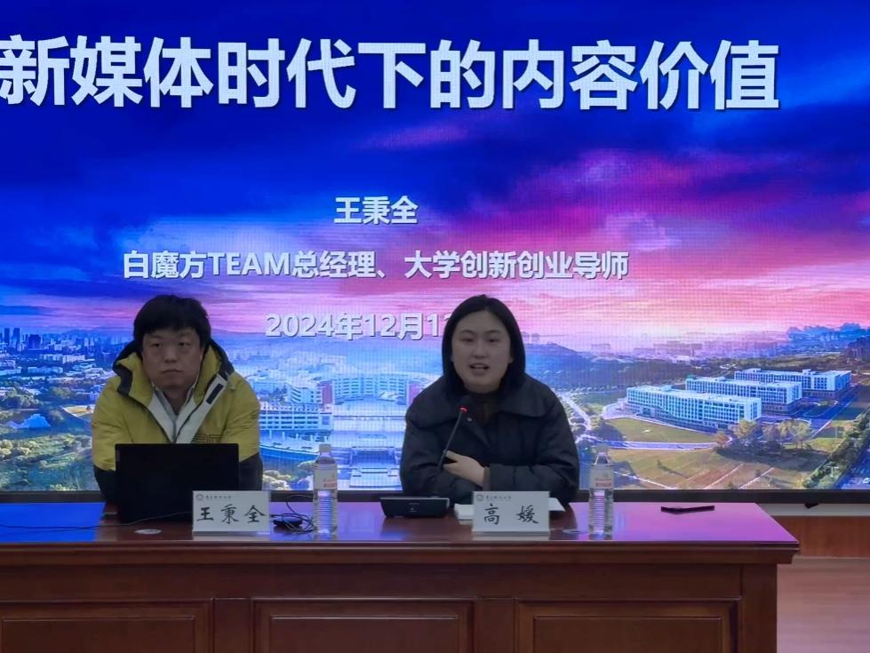 王秉全从青年学生创新创业价值、策划推广、新媒体运行等方面分别展开讲解。他表示在“新文科”建设背景下,应依托学科优势和市场需求进行选题研究,由点及面,逐步提高创新能力。在讲解项目策划推广时,他以商品广告为例,强调文化产生的商业价值是巨大的。建议青年学生应以商业思维为导向,孵化创新创业竞赛项目,将个人的“点子”转化为具有商业价值的创意。在新媒体运营方面,王秉全讲到在实际运营中,短视频文案展现出独特魅力。青年学生应拥抱新媒体、善用新媒体,聚焦市场需求,提高文字撰写能力。