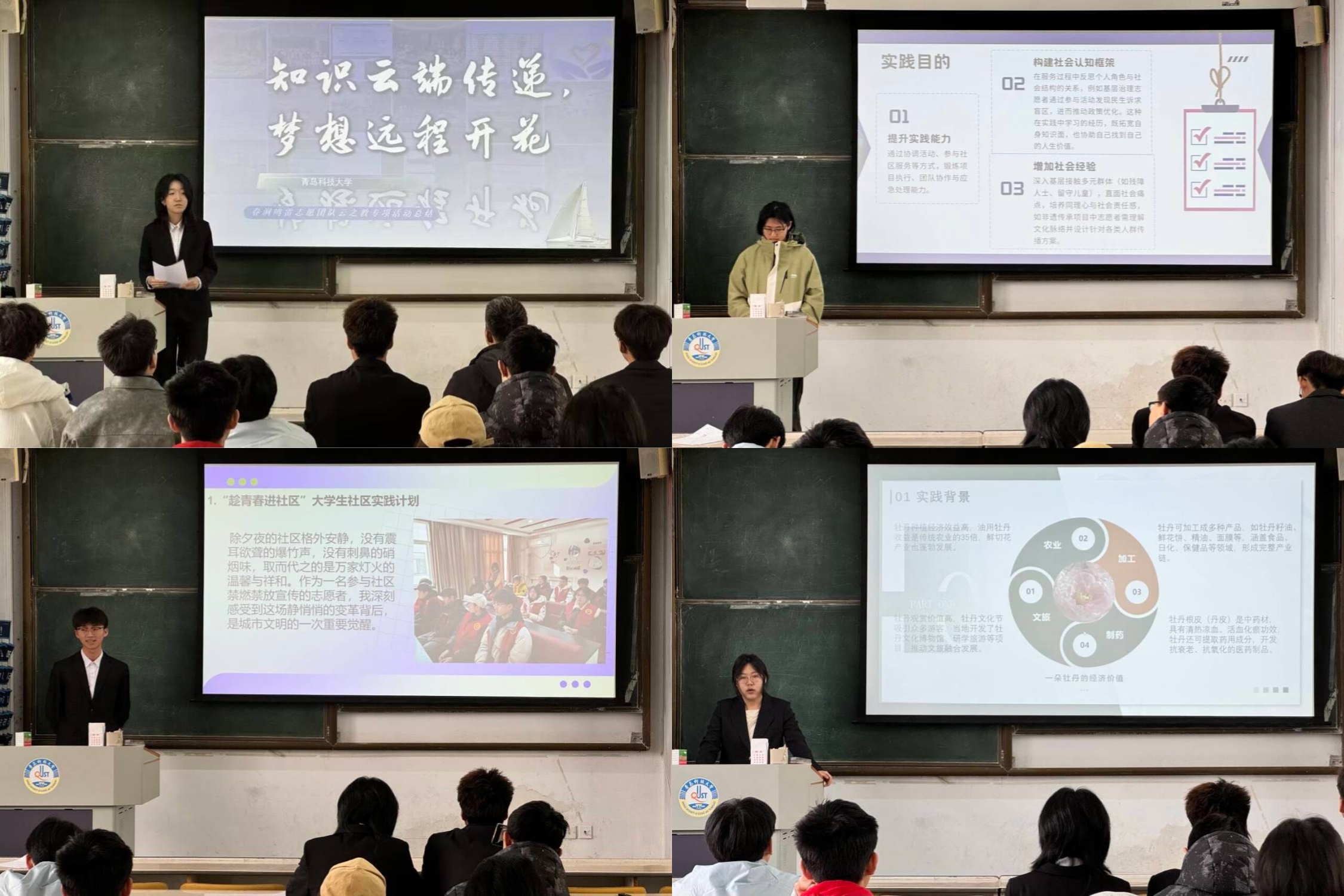 在分享环节中,来自不同实践团队的学生代表依次上台,结合精心制作的PPT和视频资料,分享了各自的实践历程。会上,李雪分享766全讯白菜网“春涧鸣雷”志愿服务团队投身教育公益,精心筹备、云端授课,助偏远地区孩子打开新世界大门,展现青年学子助力教育公平的风采;司丽珍讲述参与返家乡基层管理服务实践,在信息统计、社区服务中体会基层工作意义,坚定助力家乡发展决心;韩静娴分享在家乡康复医院“返家乡”实践,与孩子们拓印年画感受爱与希望双向奔赴,领悟生命力量与温暖;陈子鸣谈到参与返校宣讲,回溯成长、传递经验,坚定以分享助力学弟学妹追梦的信念。