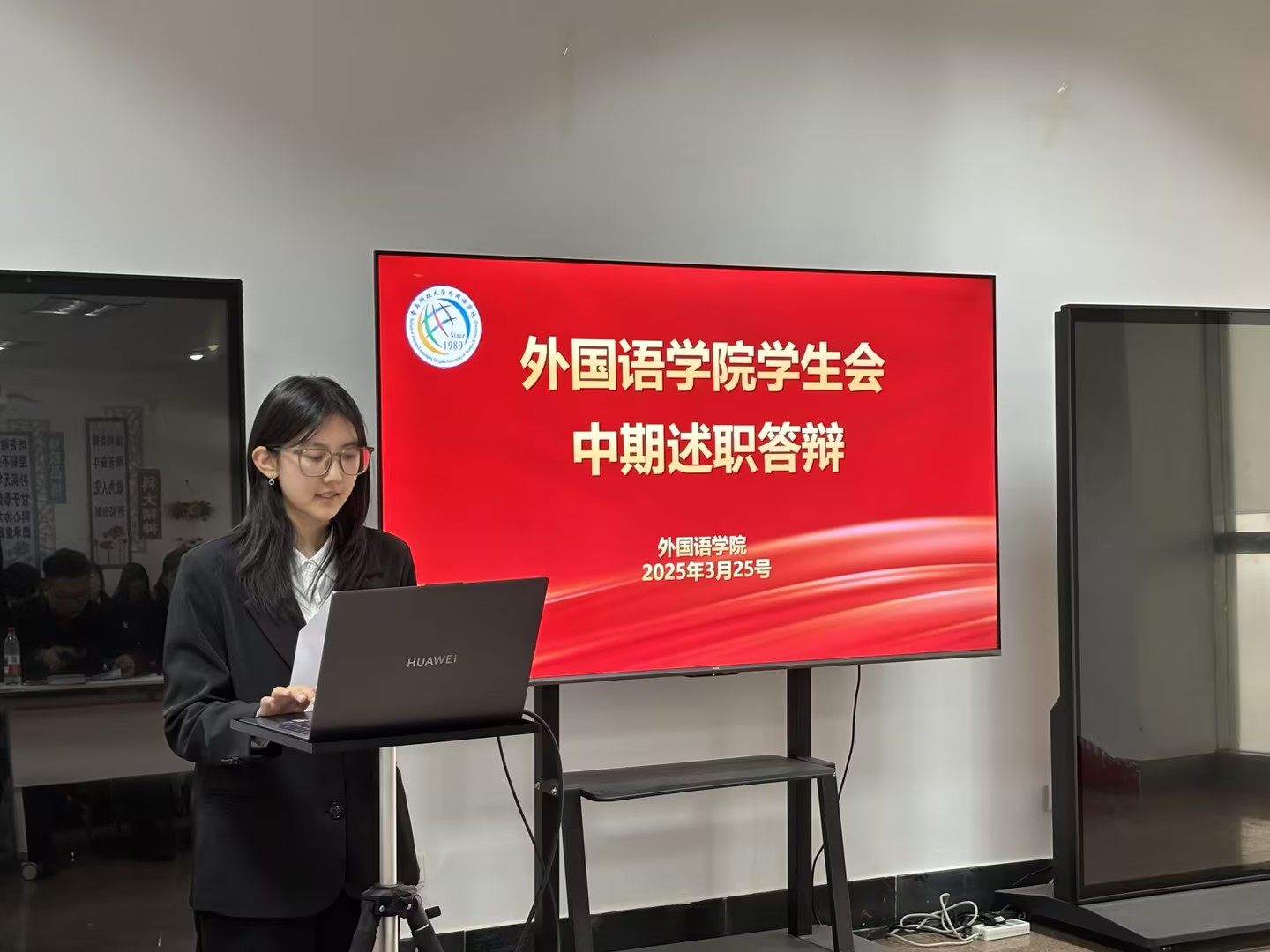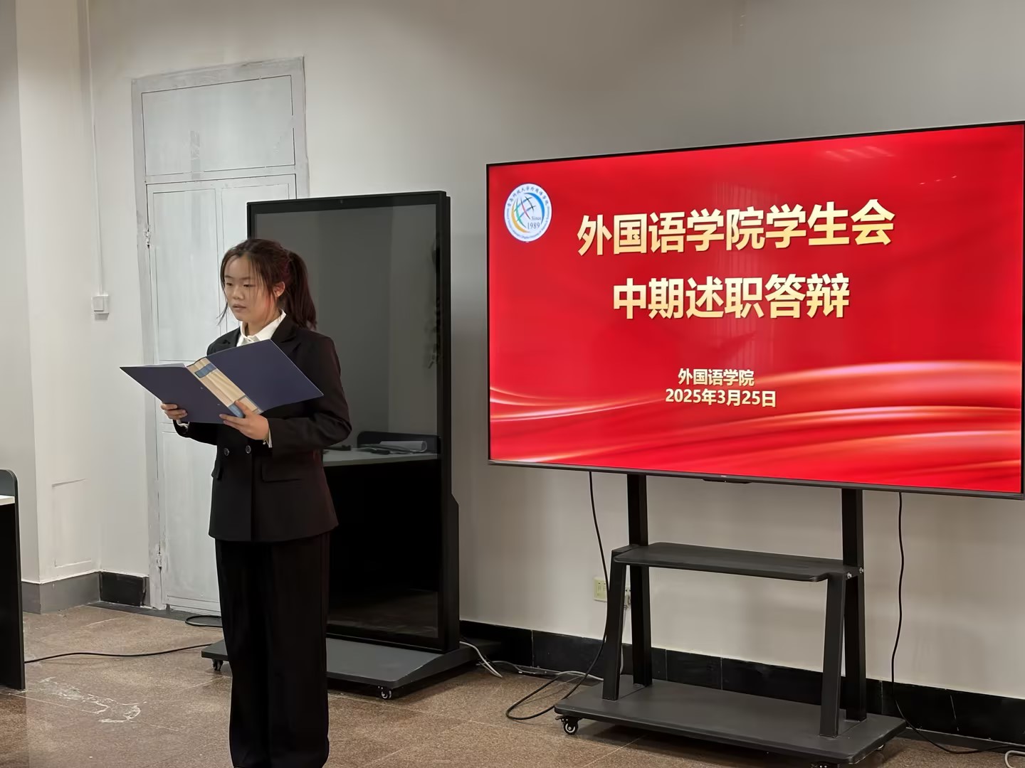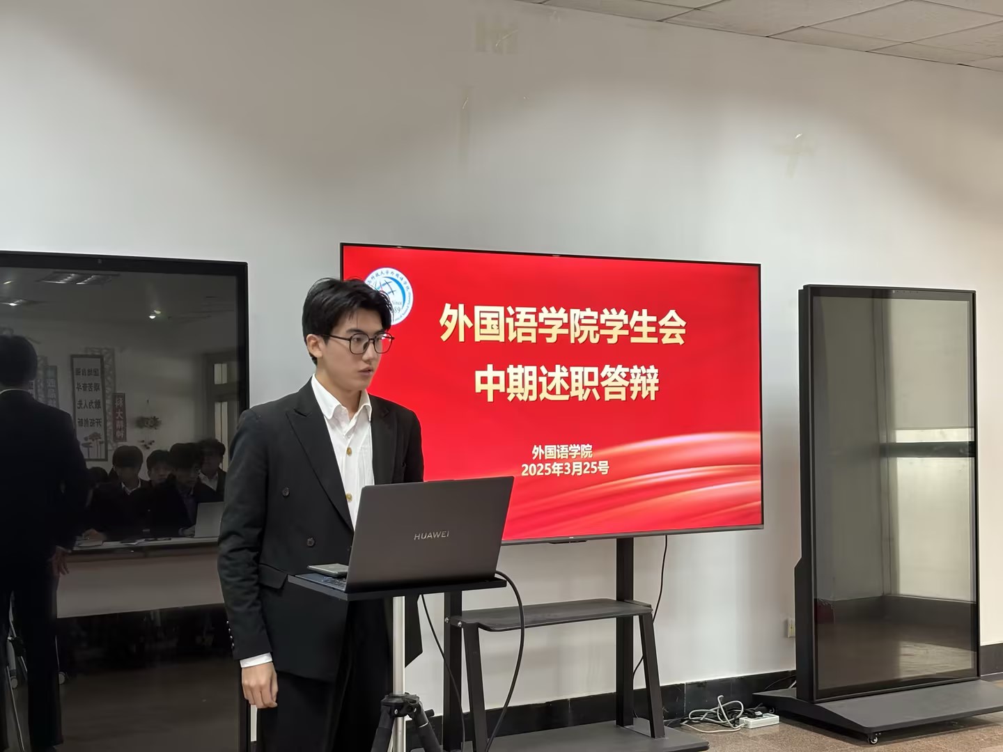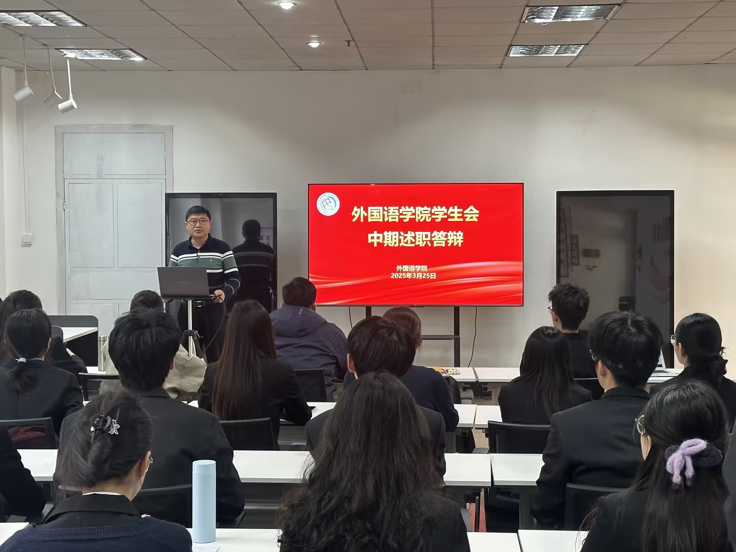 3月25日,外国语学院学生会骨干述职大会在“一站式”学生社区举行。外国语学院党委副书记兼副院长马寒、团委副书记兼学工办副主任王玉凯出席活动,学院研究生会、学生会共11个部门45名部门负责人及志愿者参加述职。会议全面总结学生组织阶段性工作成果,系统规划下一阶段发展路径,着力提升学生骨干服务能力与责任意识。