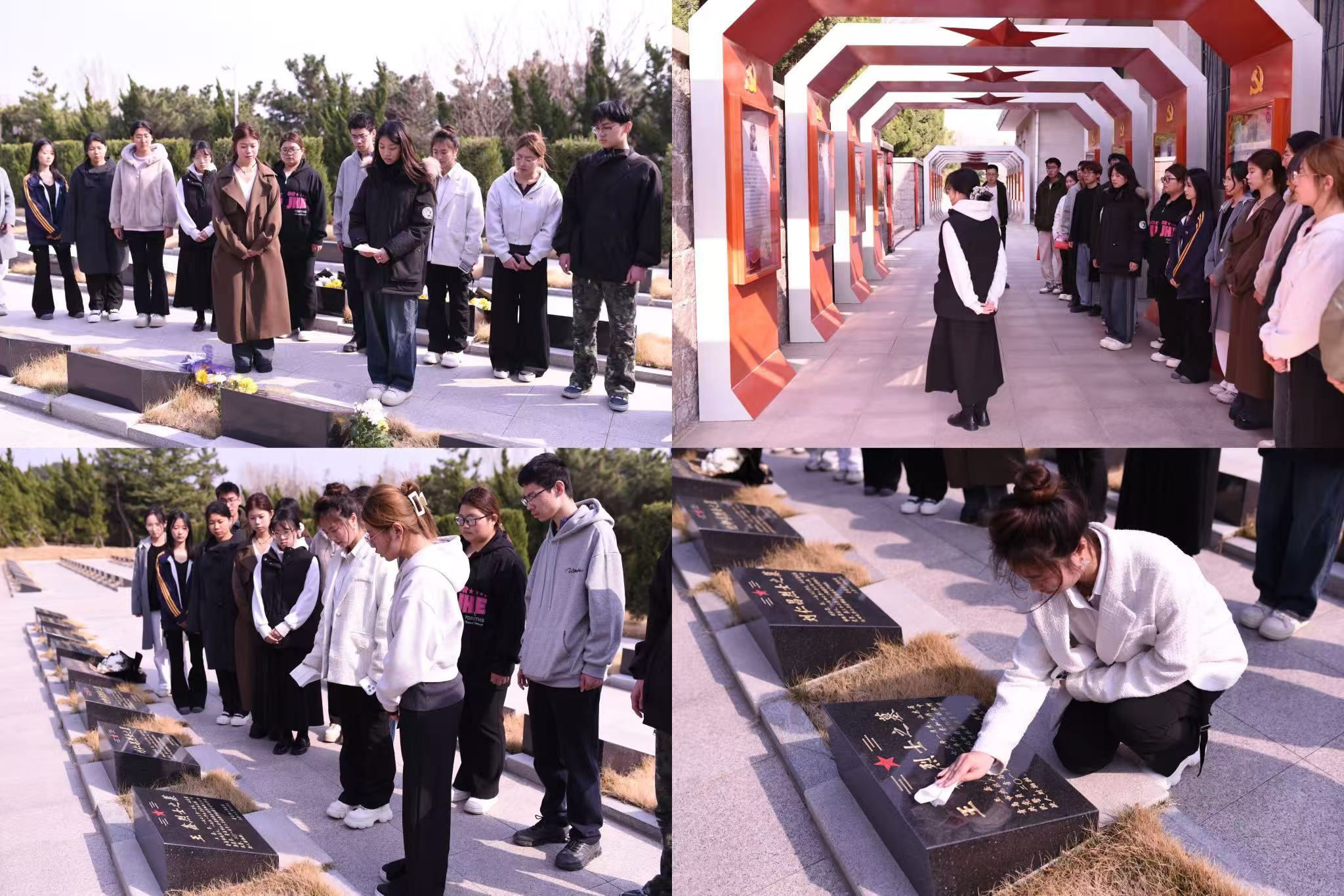 全体成员移步烈士墓区,用白布轻轻擦拭墓碑上的灰尘,从碑文镌刻的姓名、事迹中缅怀先烈。学生代表深情讲述青岛战役中“爆破英雄”王正同等烈士的壮烈故事,呼吁同学们要铭记历史,以革命先烈为榜样,树立理想,勤奋学习,为实现中华民族伟大复兴的中国梦贡献自己的力量。
