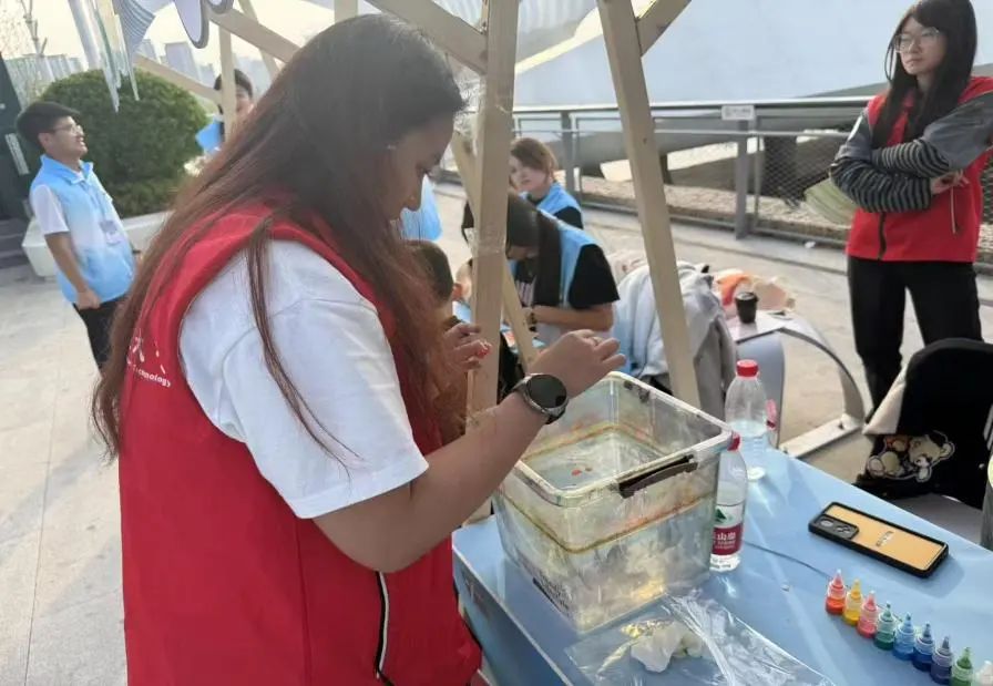 匠心筑基,非遗技艺焕发时代光彩。活动现场,“感知中国,德行齐鲁”非遗传承志愿服务队精心设计体验流程。选漆环节,志愿者以专业审美为参与者解析色彩哲学,黛蓝显沉静、赭红寓吉祥,让传统色系与现代审美对话。在调漆过程中,大漆入水瞬间晕染的涟漪如水墨丹青,志愿者细致讲解“飘漆”“沉浸”等技法要领。
