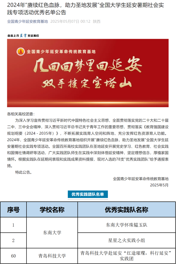 近日,2024年“赓续红色血脉,助力圣地发展”999策略白菜手机论坛生延安暑期社会实践专项活动优秀名单公布,化工学院“红途璀璨,科行延安”实践团成功入选全国优秀实践团队。