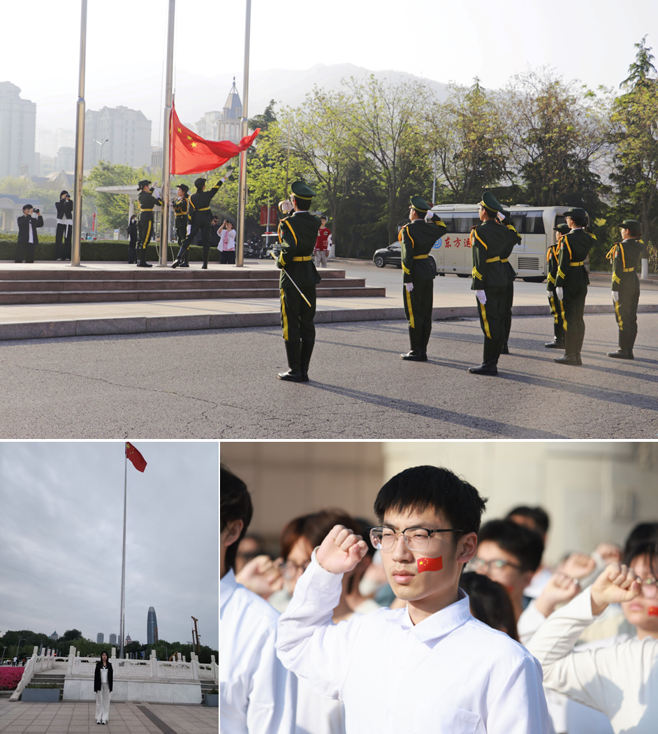 五四青年节前夕,学院组织学生参与升旗仪式。伴随着嘹亮的国歌声,五星红旗冉冉升起,全体师生肃立致敬,以最庄重的方式向祖国表达深深敬意。此外,学院组织开展“我与国旗合张影”活动,鼓励学生通过与国旗合影的方式表达爱国情怀和青春誓言。照片中一抹抹鲜艳的红色,映照着青年对祖国的热爱与祝福,也彰显了新时代大学生昂扬向上的精神风貌。