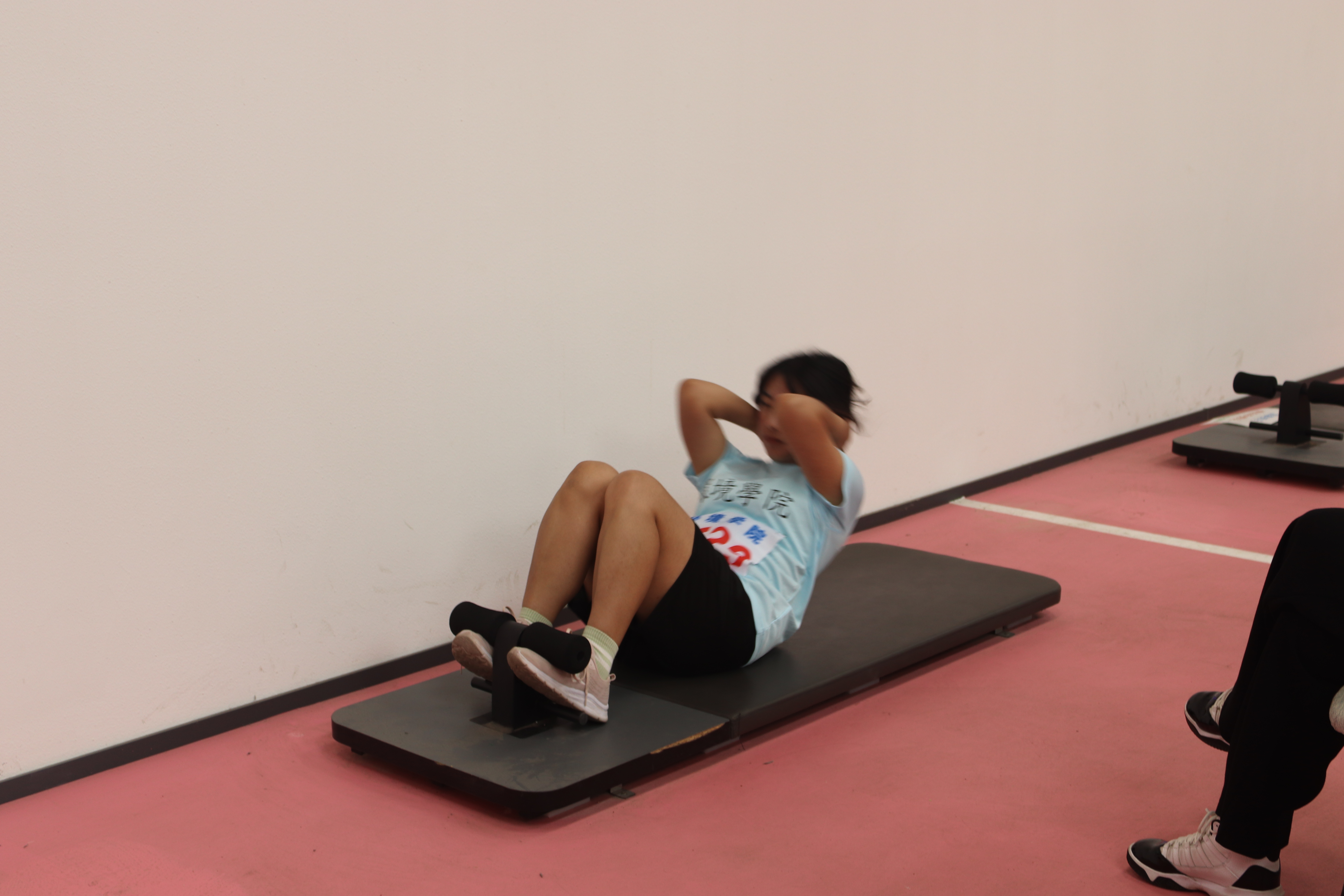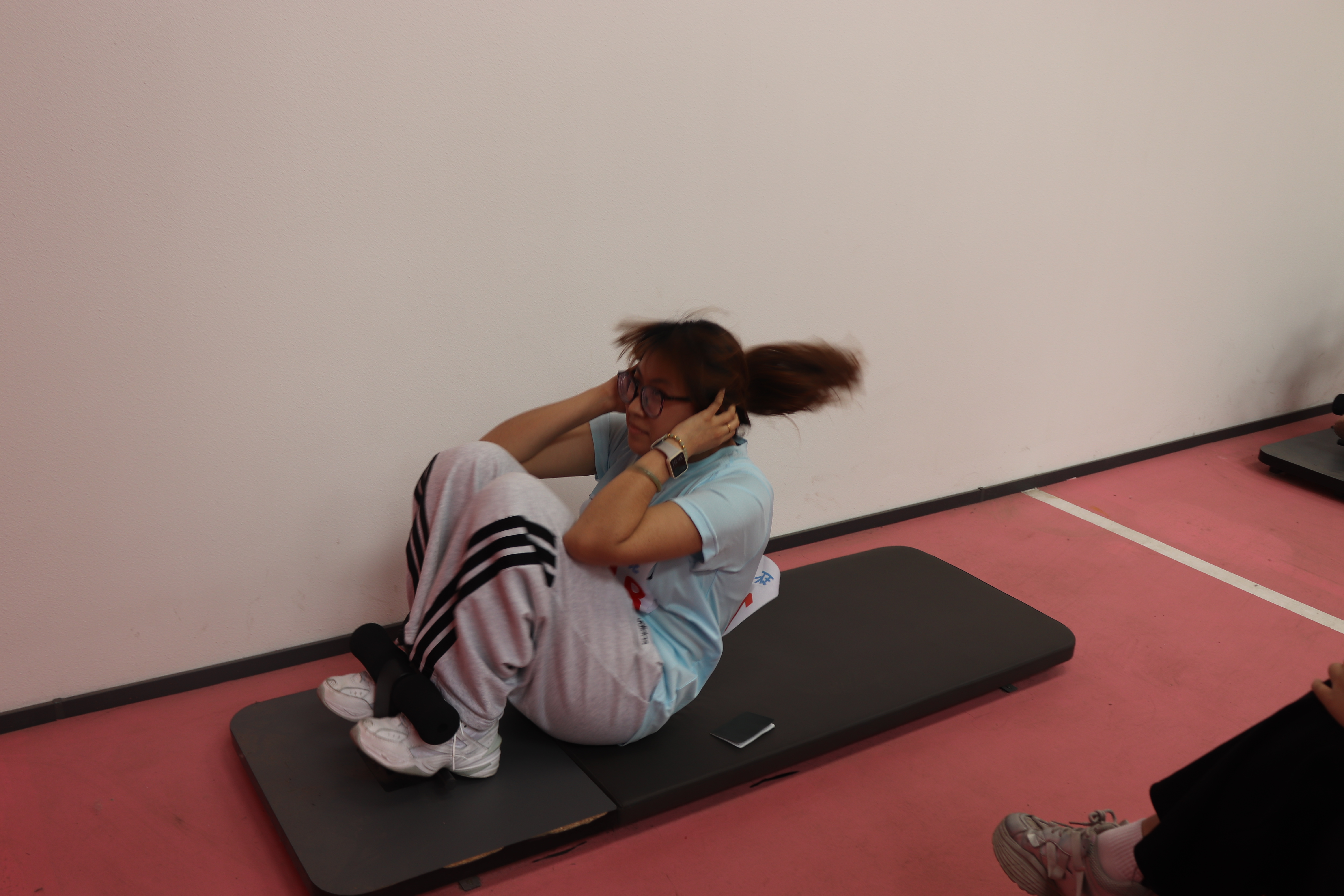 引体向上比赛区,运动员双手紧握横杆,青筋暴起、面色坚毅,每一次拉引都是体能的较量。仰卧起坐赛场,女生们在垫子上排列整齐,随着口令起起落落,汗水浸透了发梢,却没有一人放慢节奏。环境学子用行动证明:坚持,就是最美的胜利姿态!